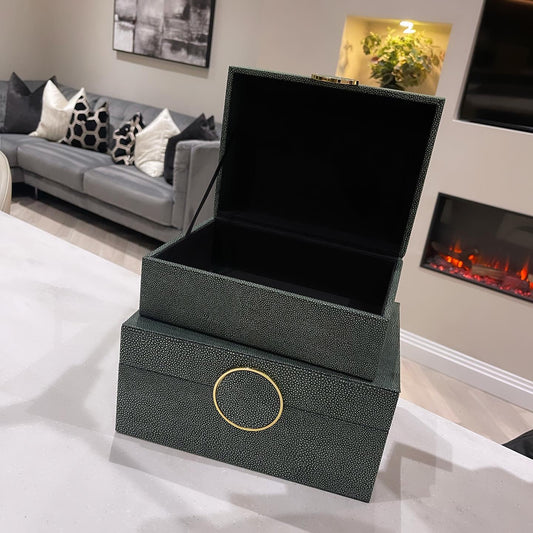 Green and Black Faux Litchi Leather Boxes Set of 2