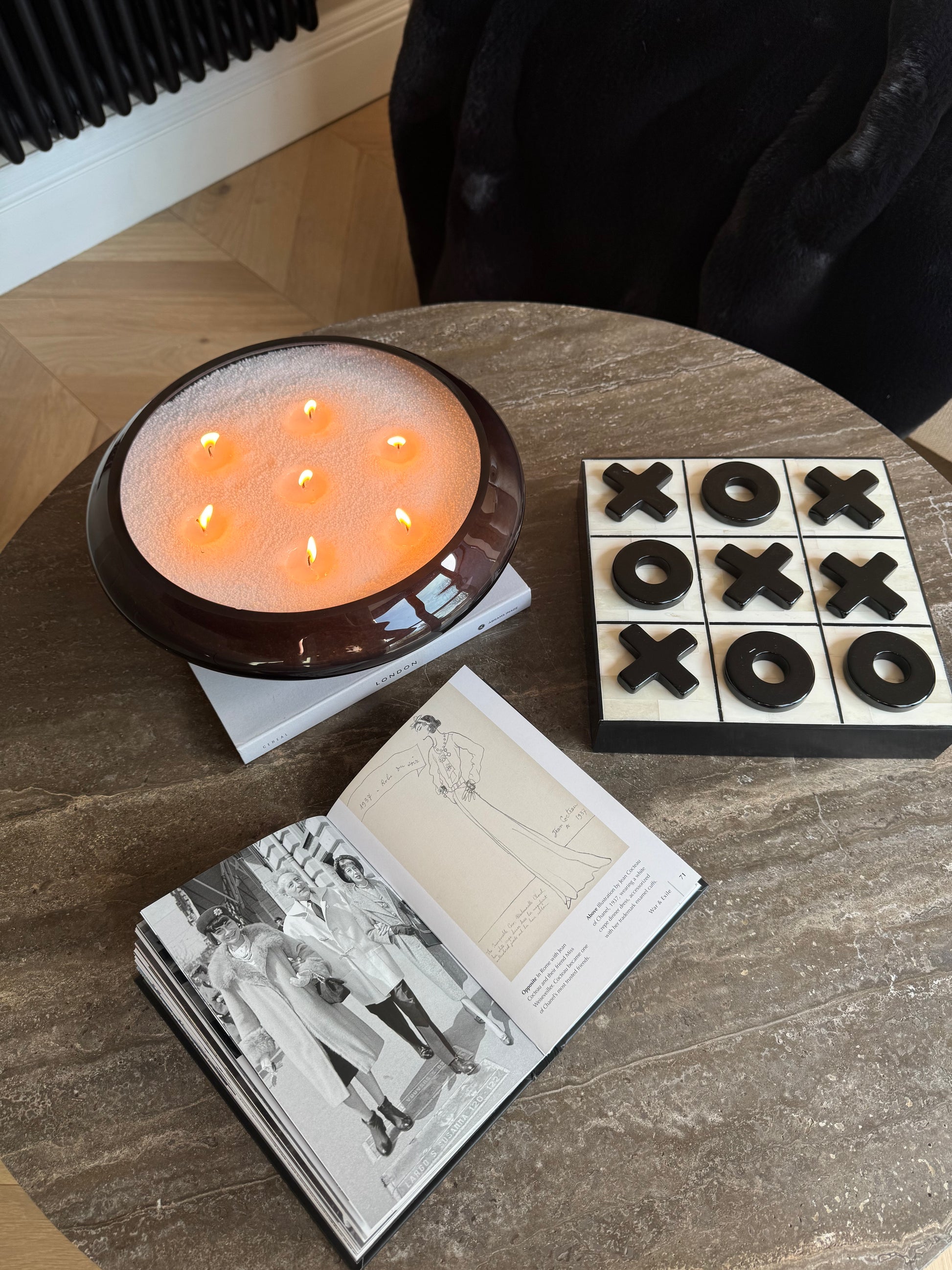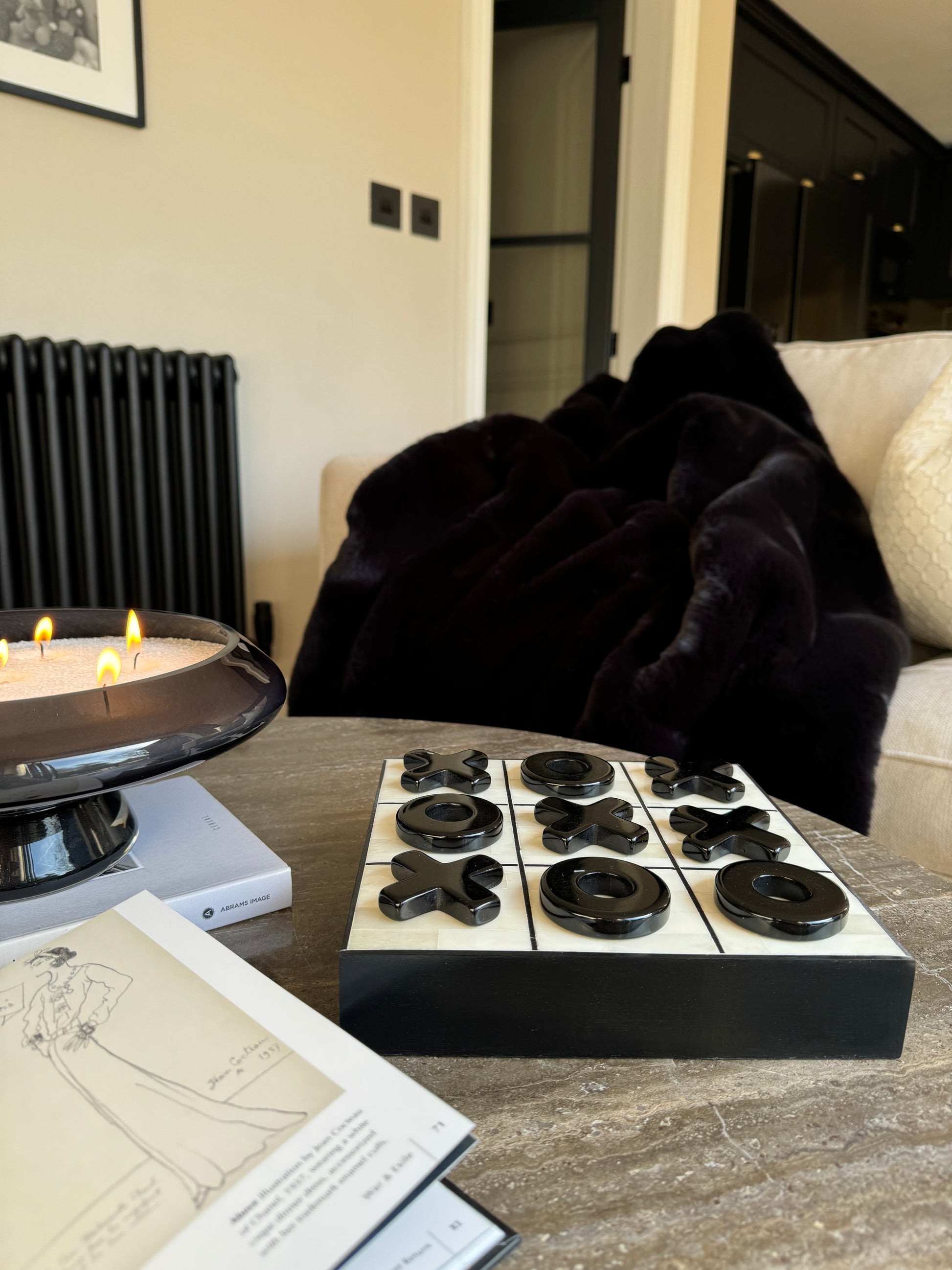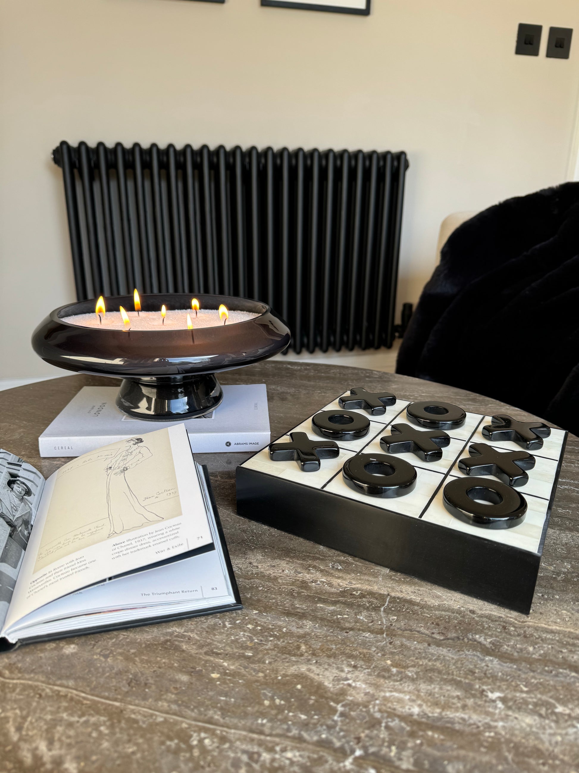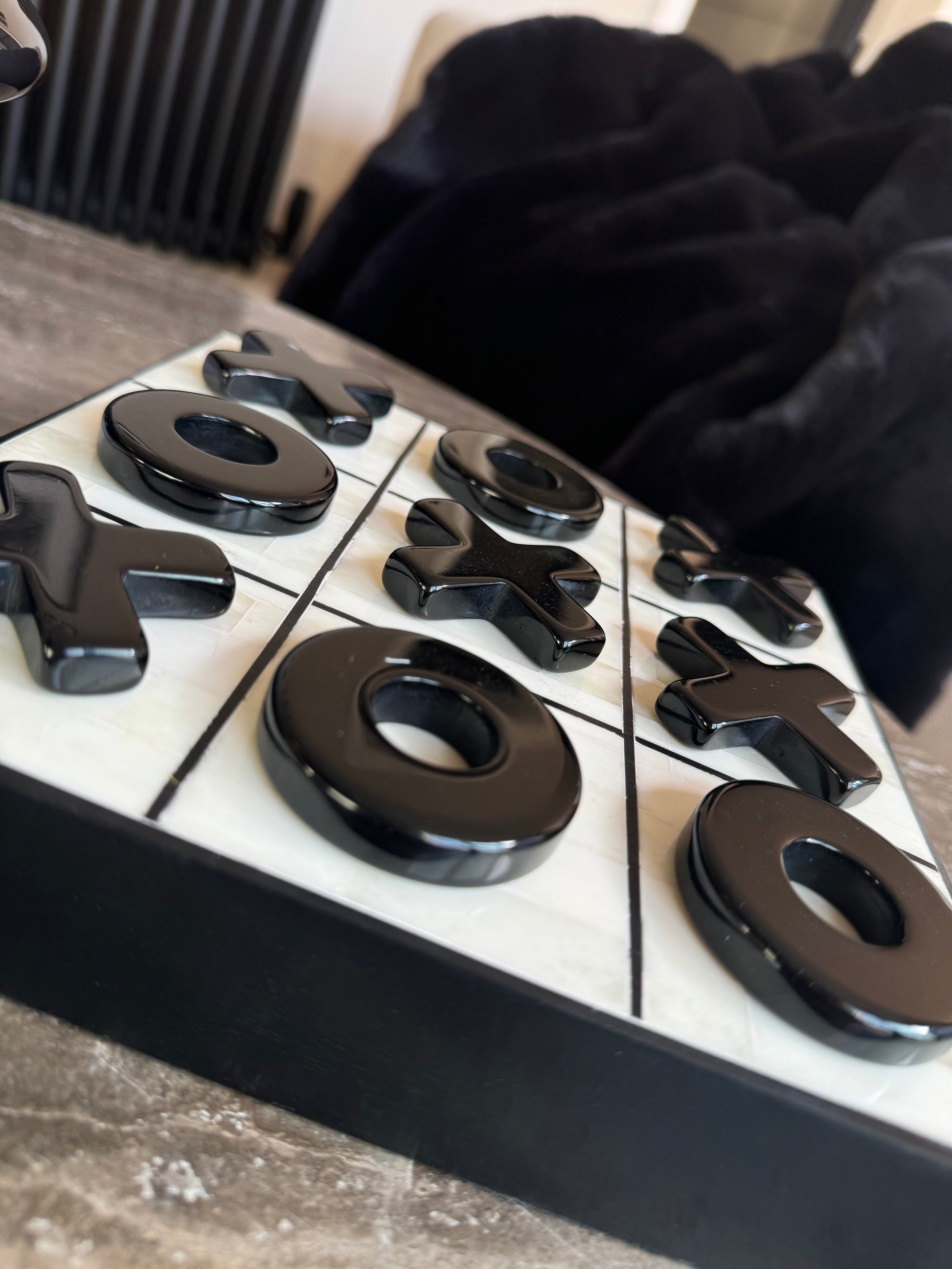 Elevate your decor with the Chollerford Bone Inlay Noughts and Crosses Game, a perfect blend of playfulness and sophistication. Featuring a bone inlay playing surface set atop a sleek black resin box, this timeless game adds a touch of elegance to your space. The black resin playing pieces complement the refined aesthetic, making it as stylish as it is entertaining.