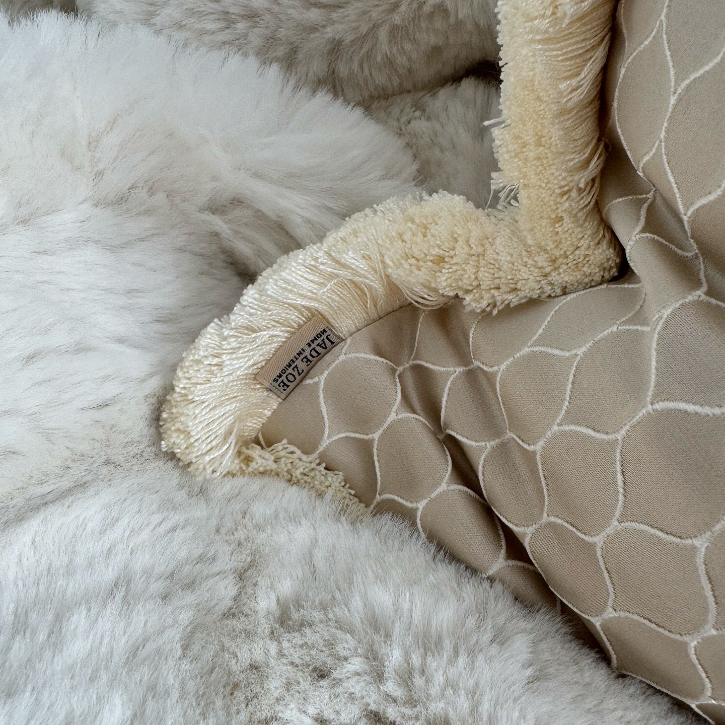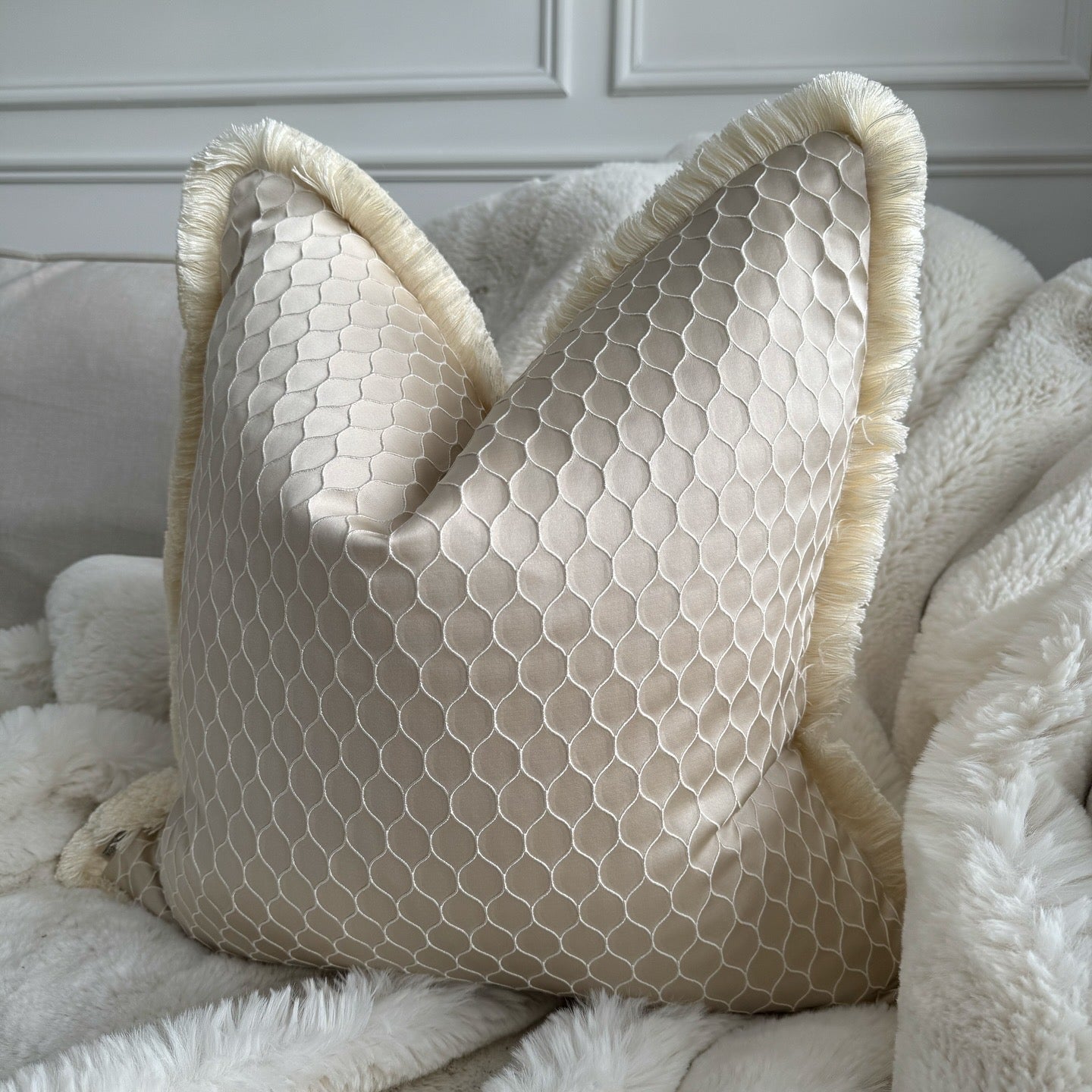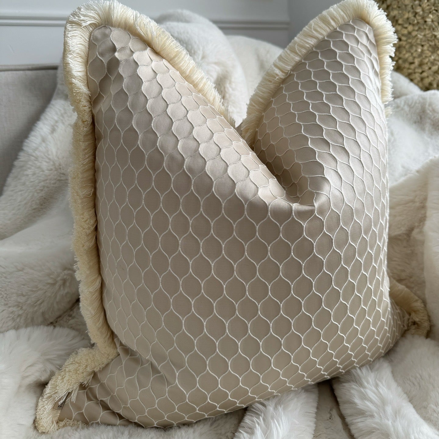 The subtle champagne hue seamlessly blends with various interior styles, making it a versatile addition to any room. What sets this cushion apart is the hand-stitched ivory fringed edge detail, adding a touch of artisanal elegance and unique character to each piece.
