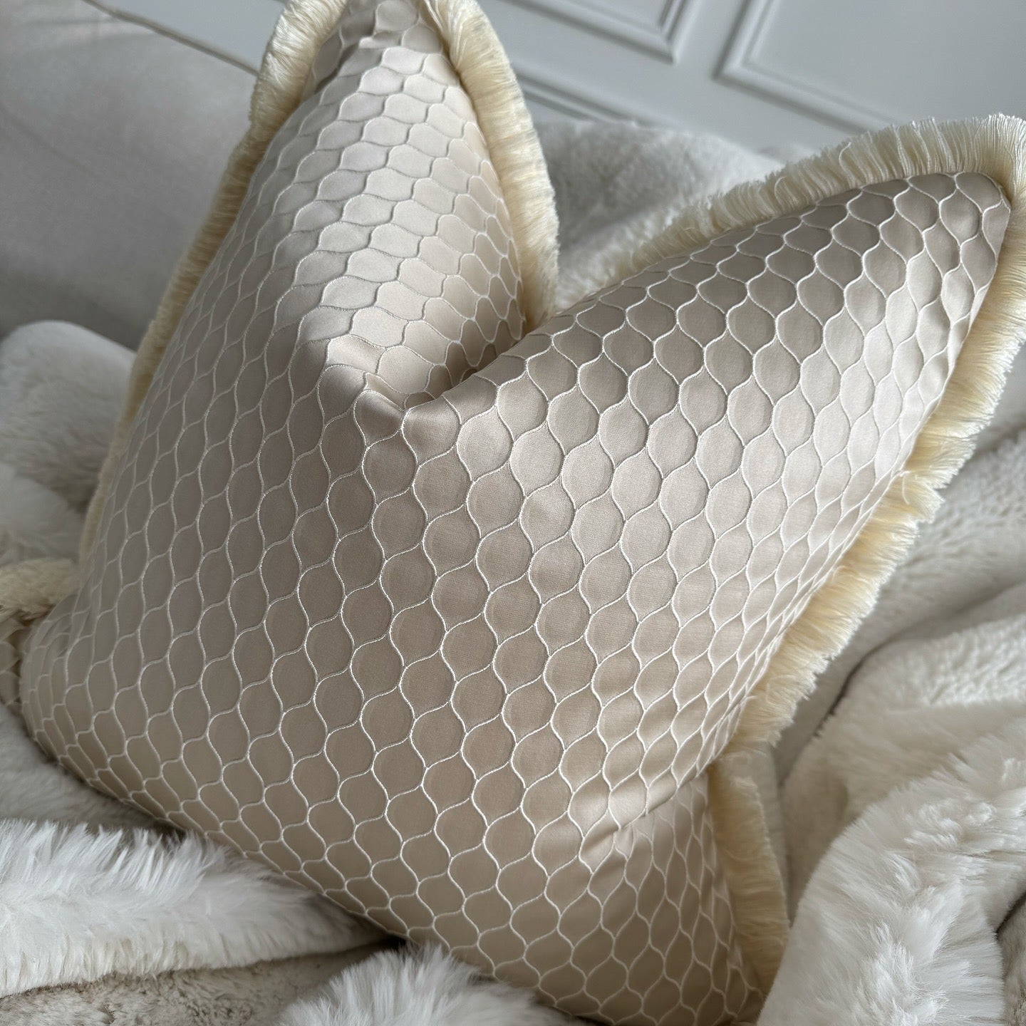 Enhance your home with the bespoke Cinder champagne satin sheen 3D patterned cushion, featuring hand-stitched ivory fringed edges. This luxurious and stylish cushion promises to bring a touch of refined sophistication and comfort to any setting.