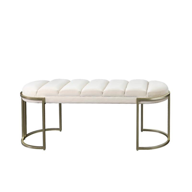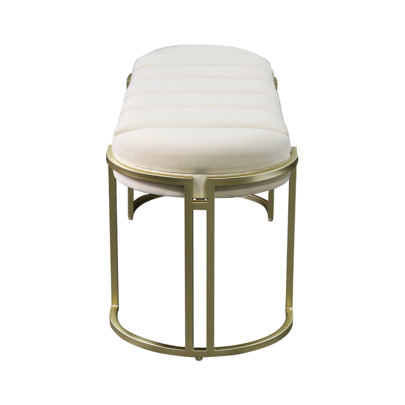 The sleek, curved legs, finished in champagne gold, provide a sturdy yet graceful base, effortlessly complementing the bench’s elegant design. Perfect for seating or as a statement piece, this versatile bench combines beauty and function in one.
