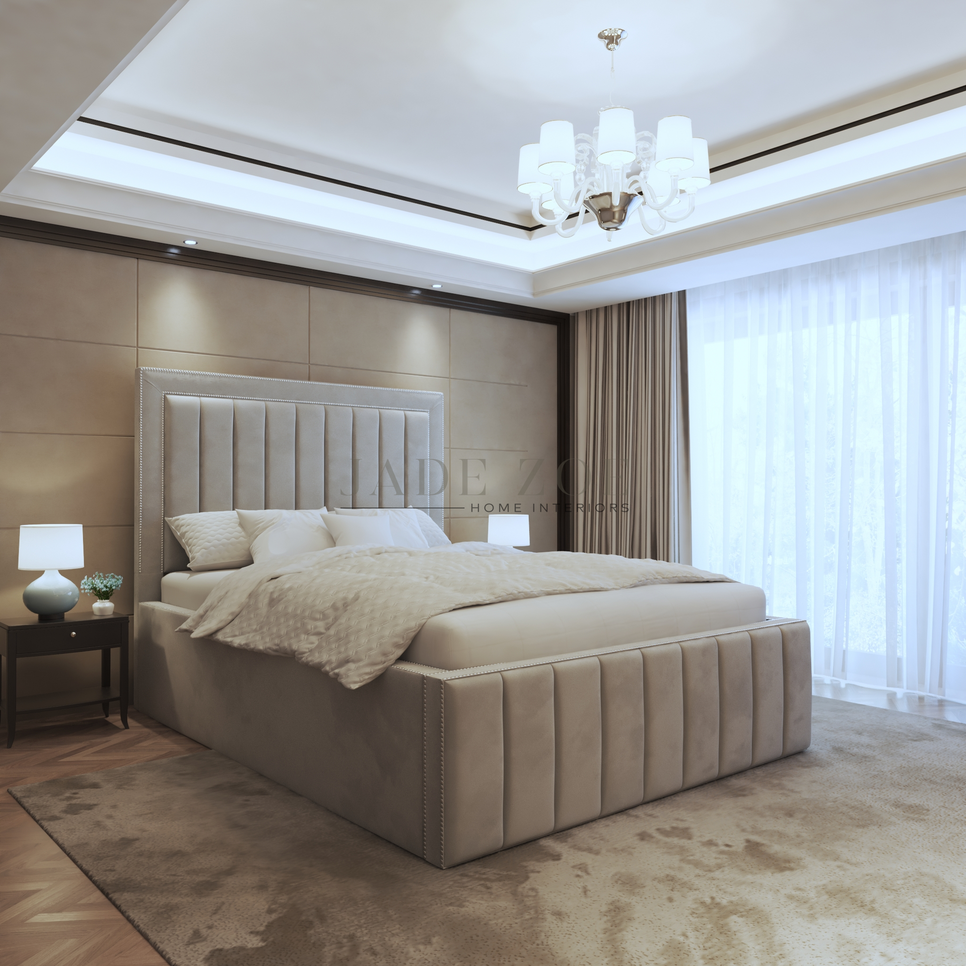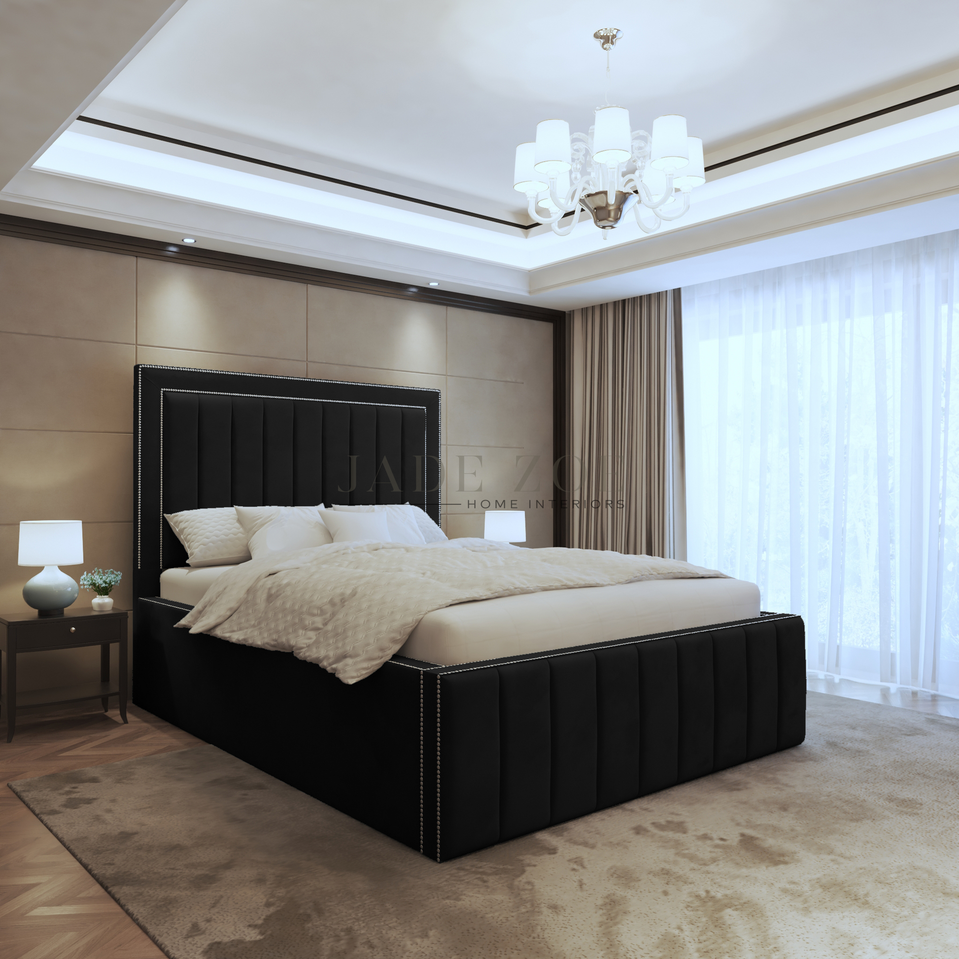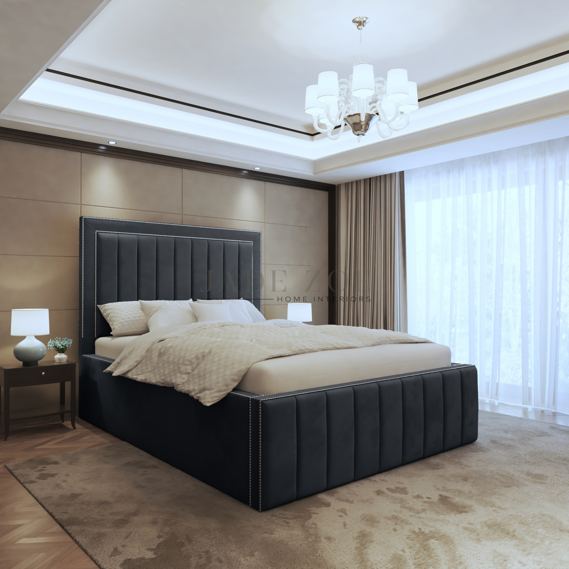 Introducing our Giovanna luxurious bed crafted with the finest plush velvet and studded edge detailing for a touch of glamour. The head board and base board feature a lined quilted effect, exuding elegance and sophistication.