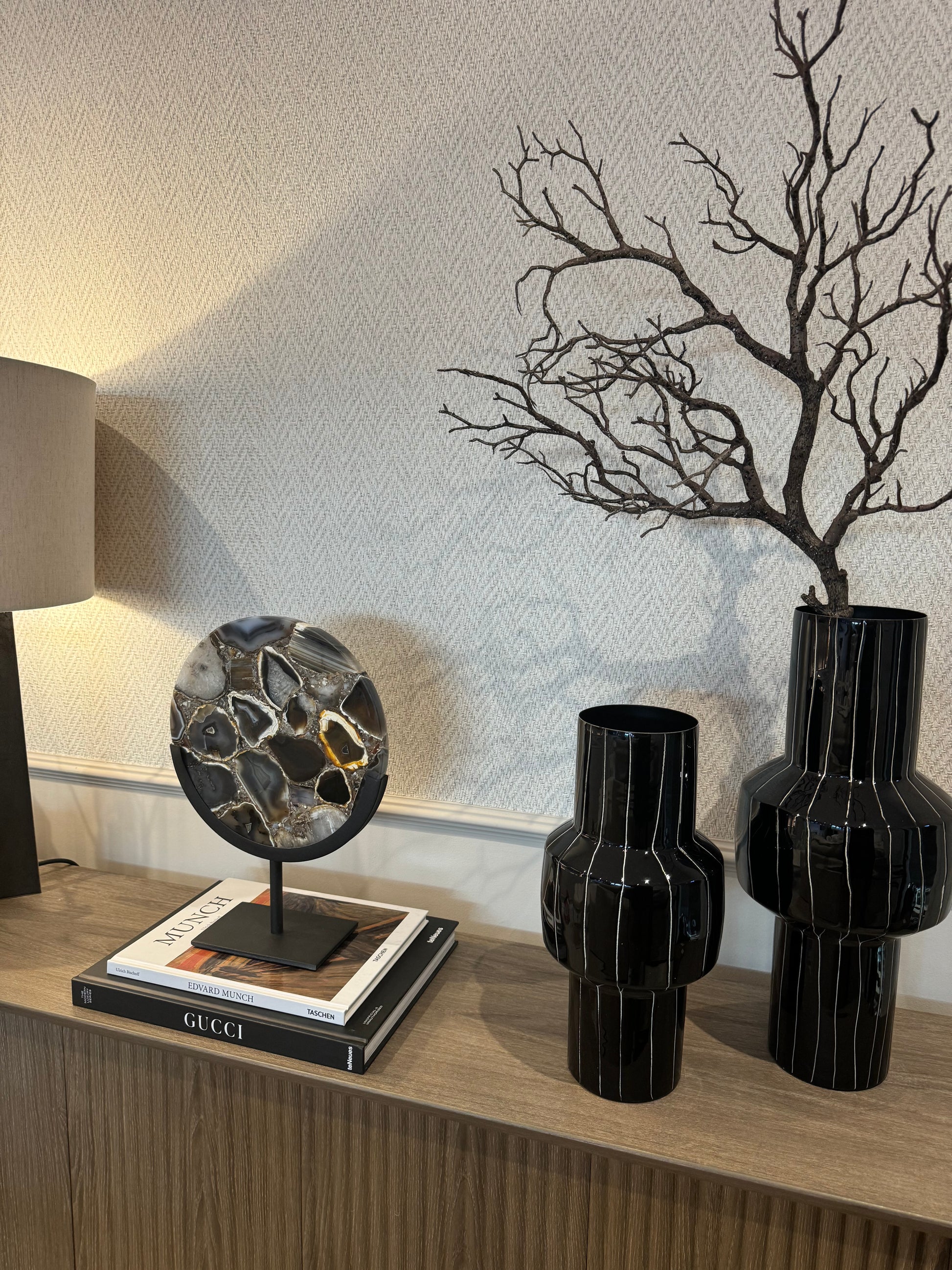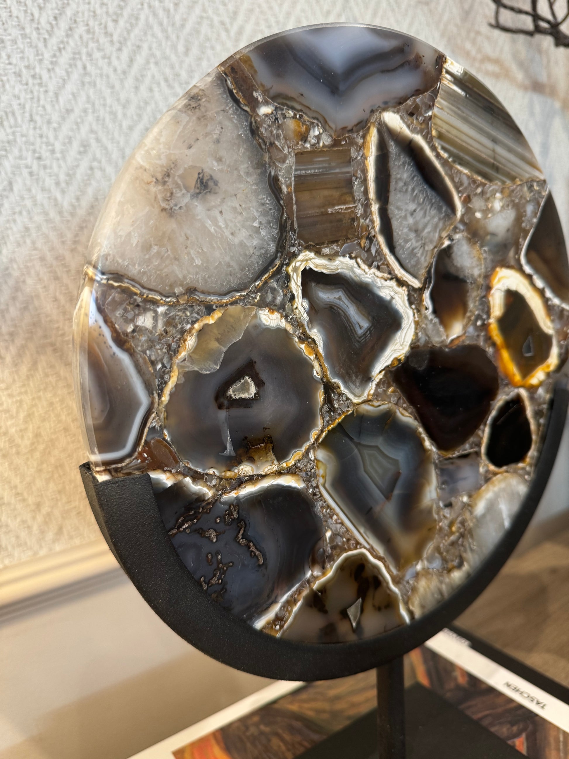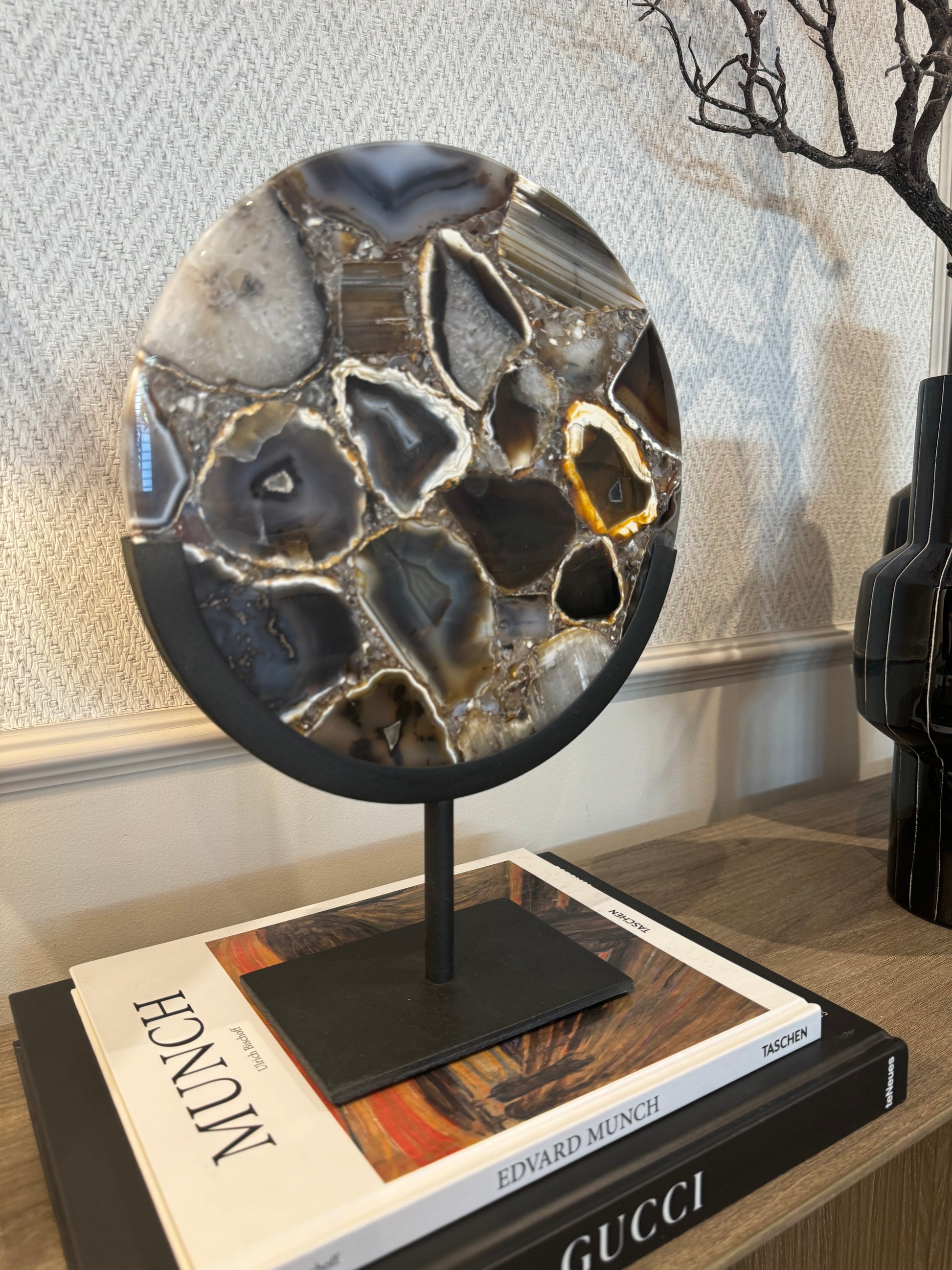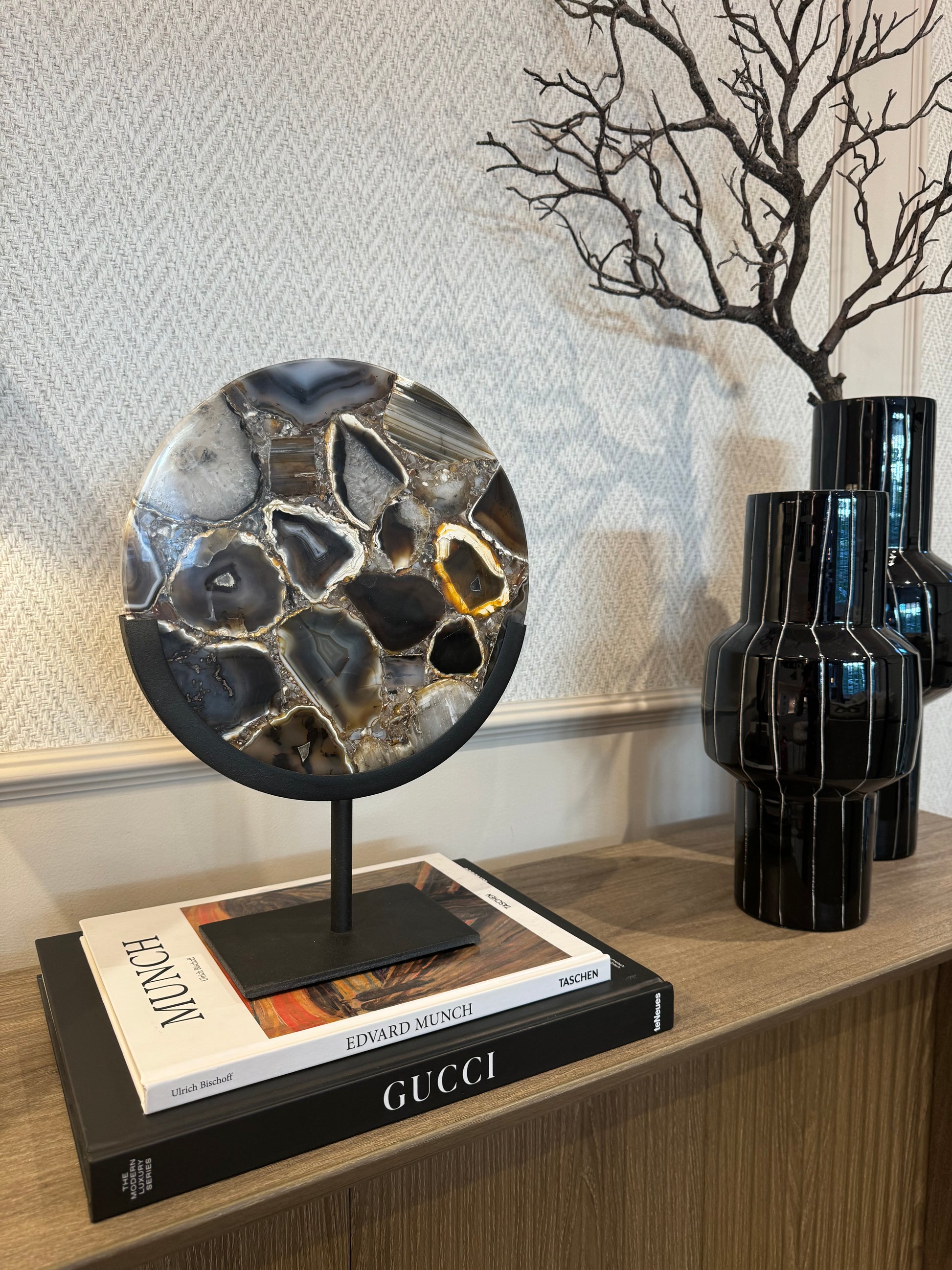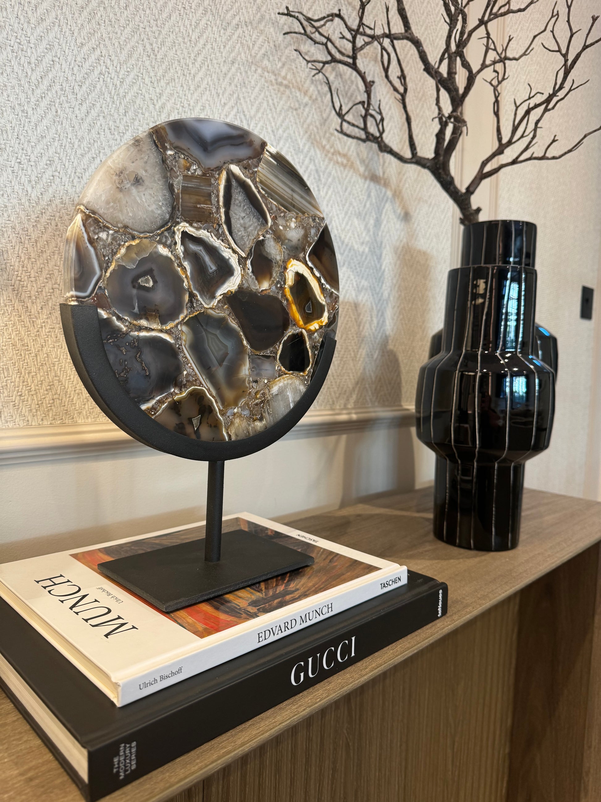 Add timeless elegance and modern sophistication to your home décor with our Gouya Agate Ornament on Base. Crafted with care and designed to impress, this decorative piece features a beautifully polished natural agate stone set atop a sturdy matt black metal base, offering a perfect fusion of organic charm and contemporary style.