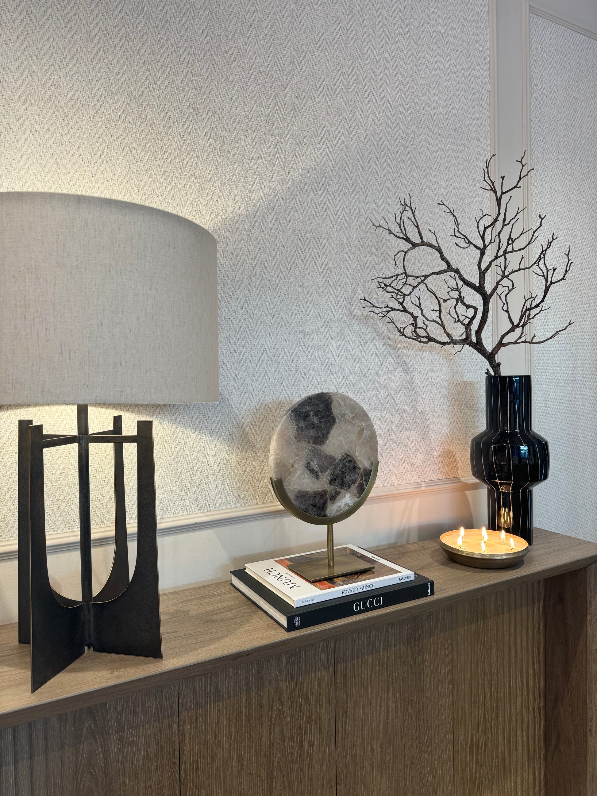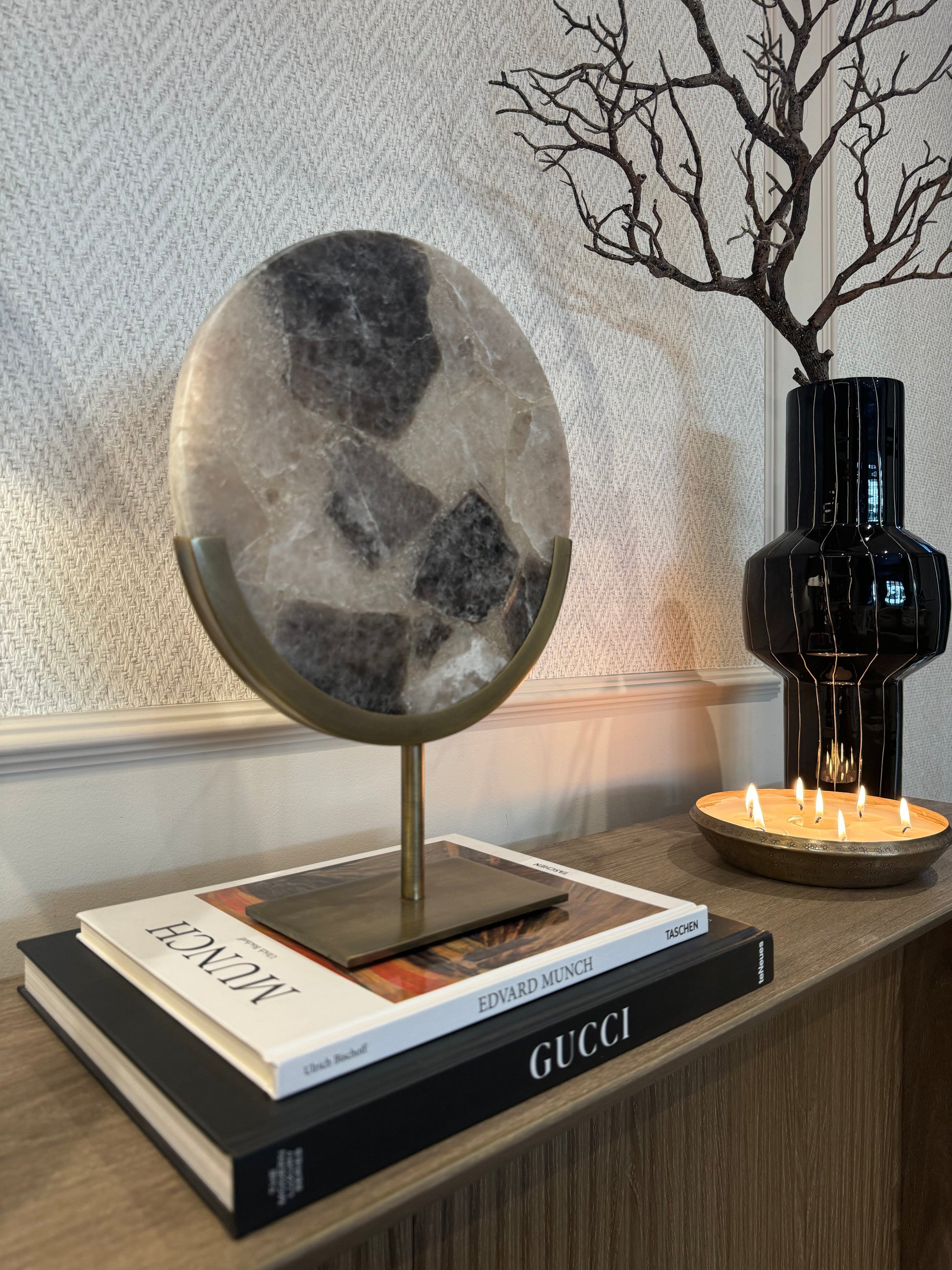 The rich bronze base grounds the design, providing a sophisticated contrast that complements both modern and classic interiors. Whether styled as a standalone focal point or paired with other decorative accents, this piece adds an effortless sense of luxury and balance.