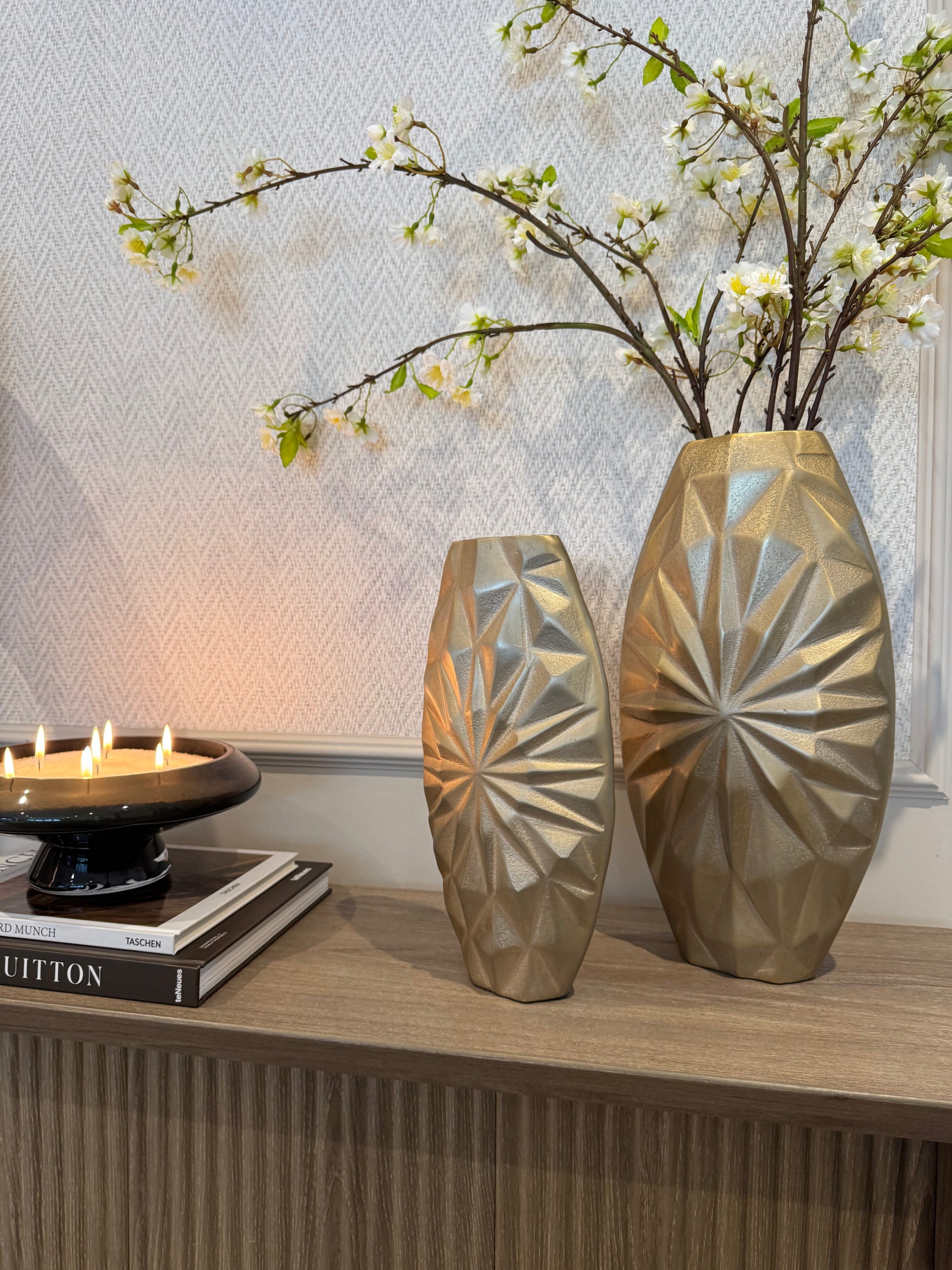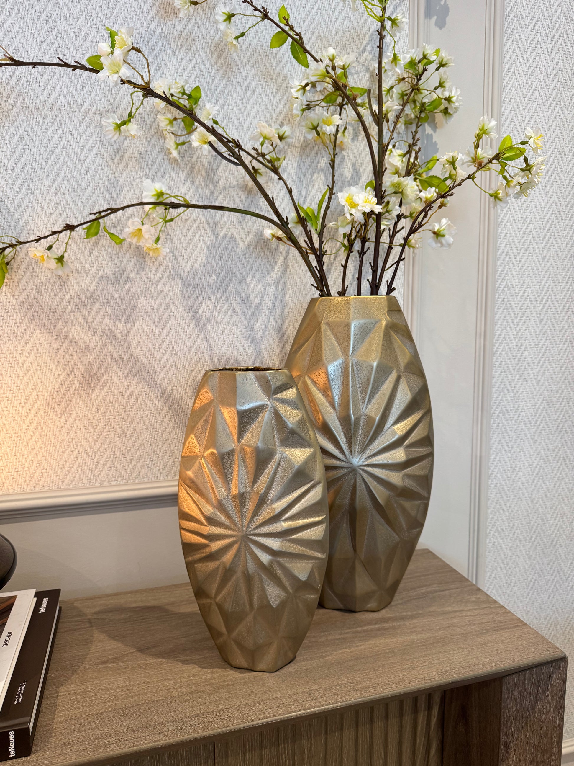 Finished in a soft champagne hue, the vase exudes a gentle warmth that complements both minimalist and luxurious interiors. Measuring 16 x 8 x 32 (WxDxH), and available in two sizes—30 cm and 40cm in height—it makes a sophisticated statement on shelves, sideboards, or console tables.