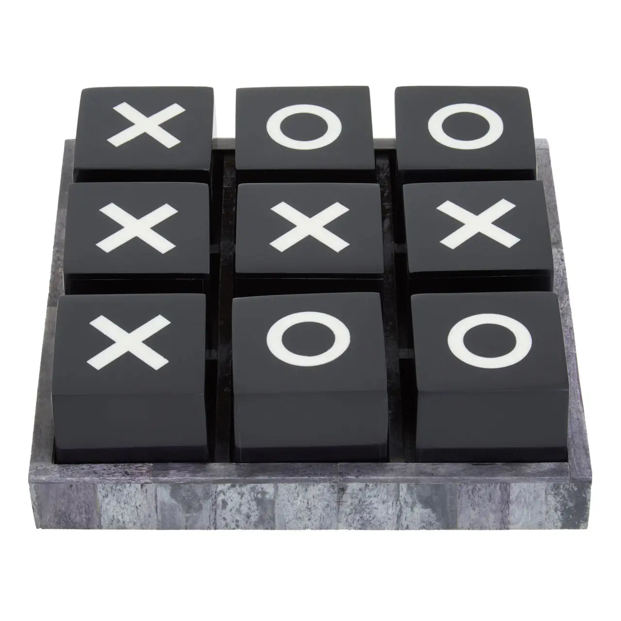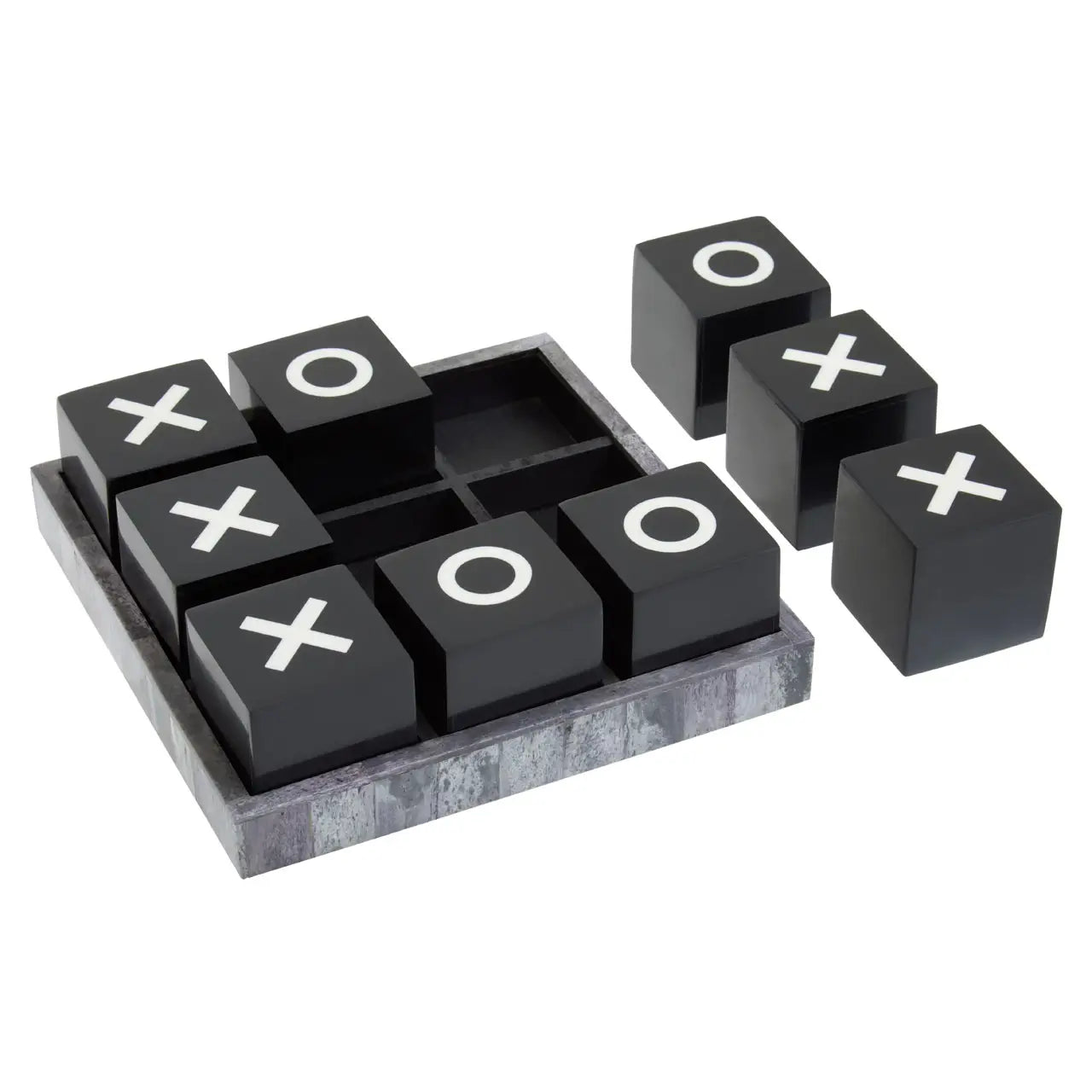 This game set will add a visual display on a coffee table or desk with sculptural playing pieces. With a chic grey effect base, this set includes 9 black pieces with 5 crosses and 4 noughts in white finish offering glamour and a playful accent.