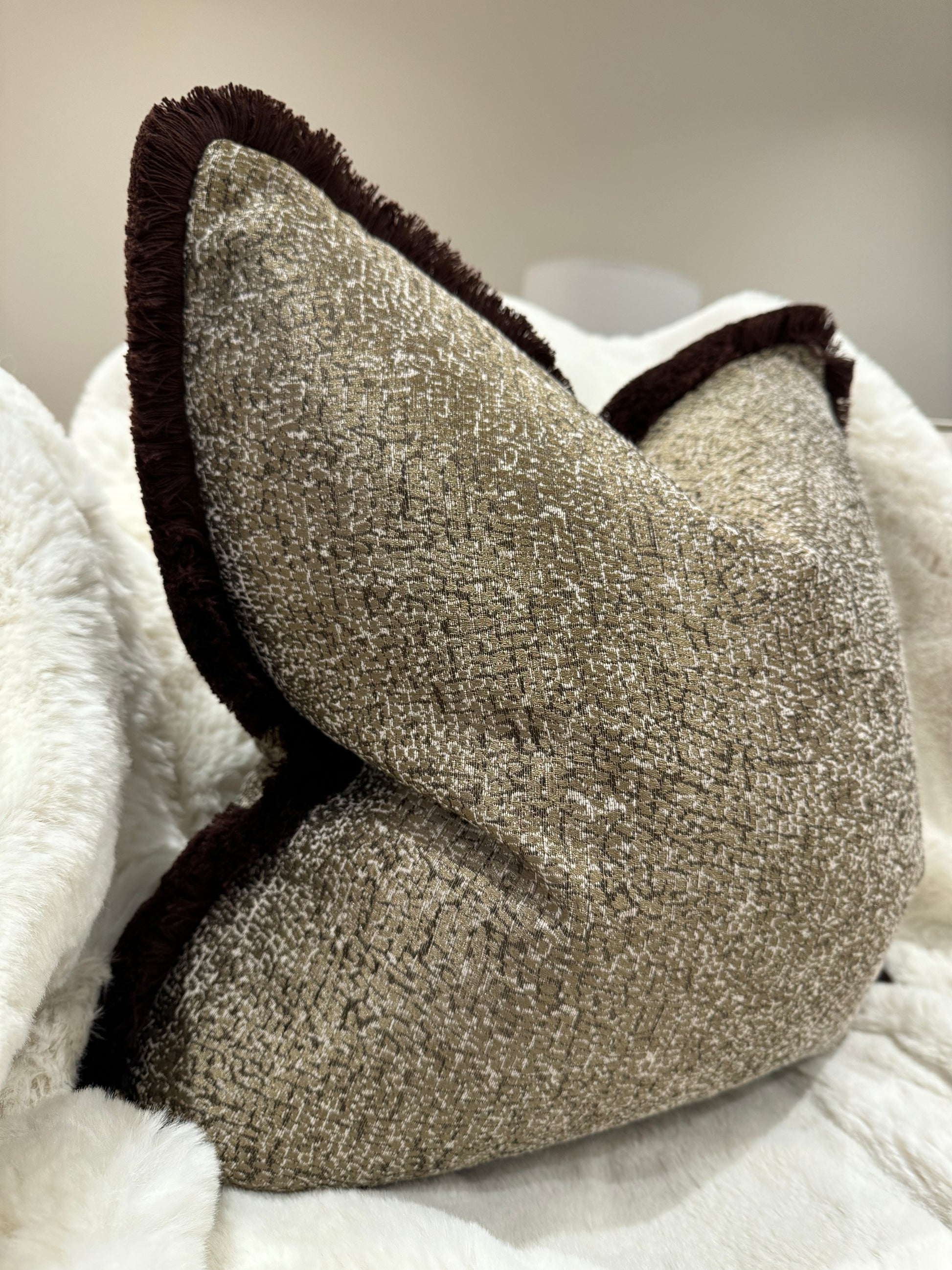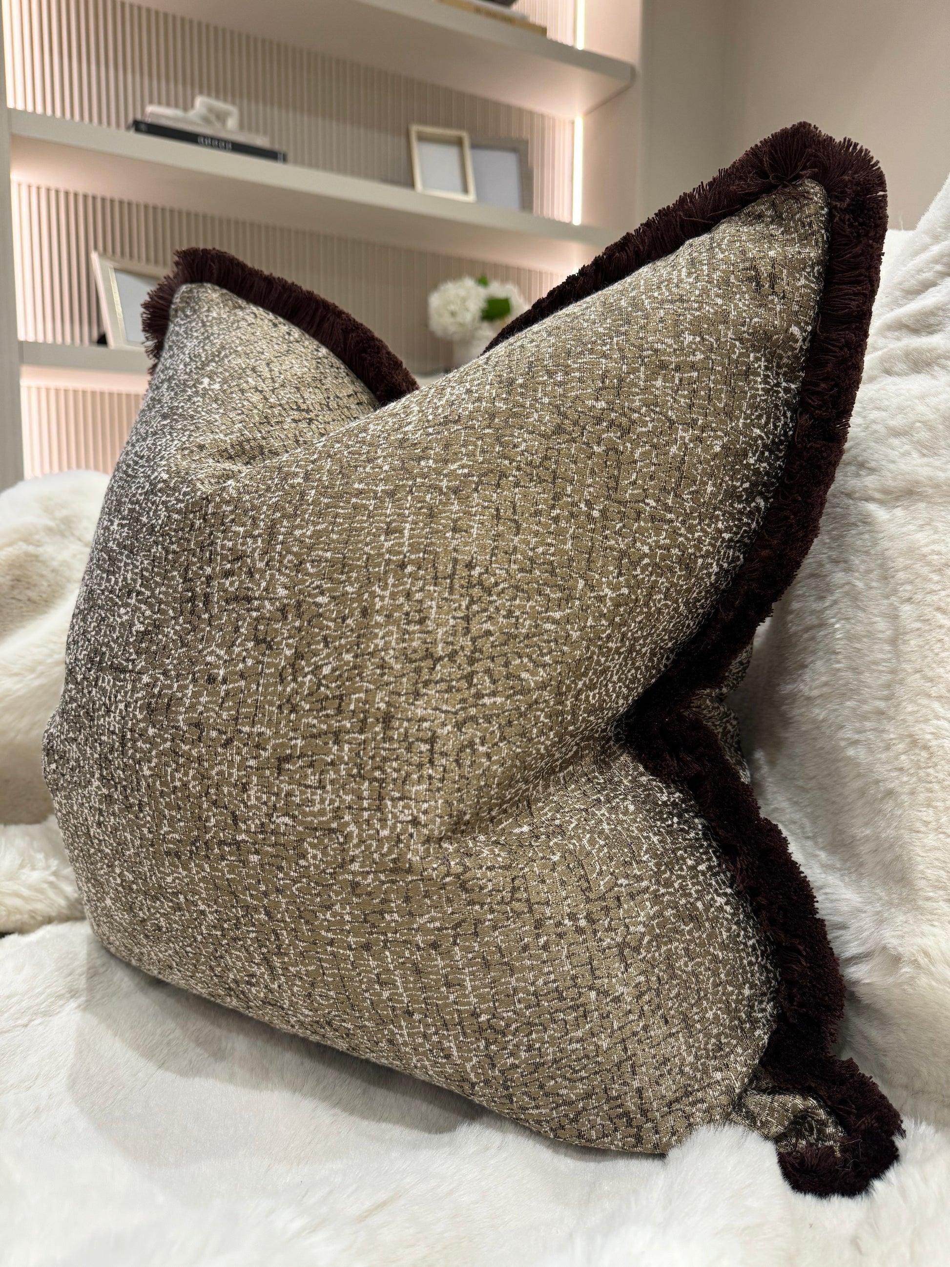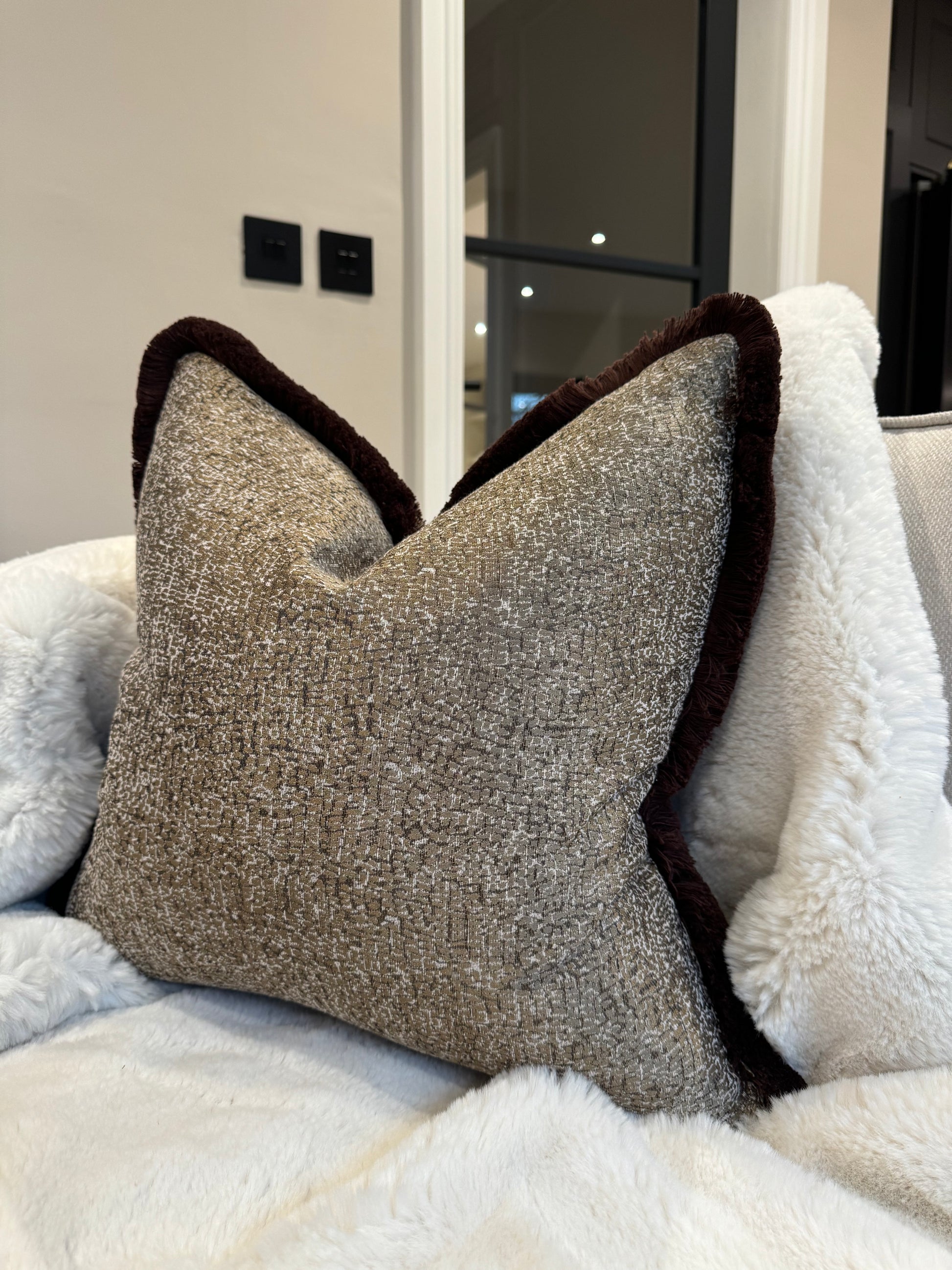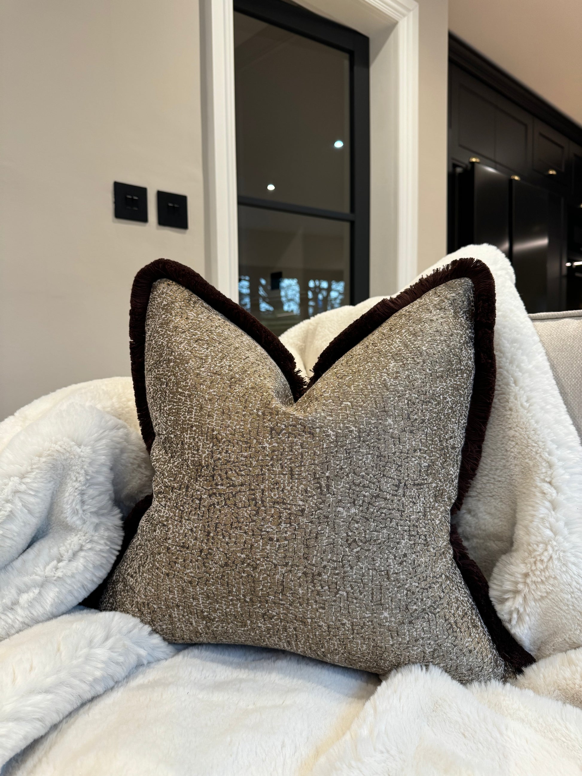 The hand-stitched luxe chocolate fringe trim enhances its opulent appeal, making it an ideal choice for those who love designer cushions, luxury home décor, and elegant soft furnishings. Each cushion is crafted with premium materials and comes complete with a high-quality feather insert, ensuring a plush and inviting feel.