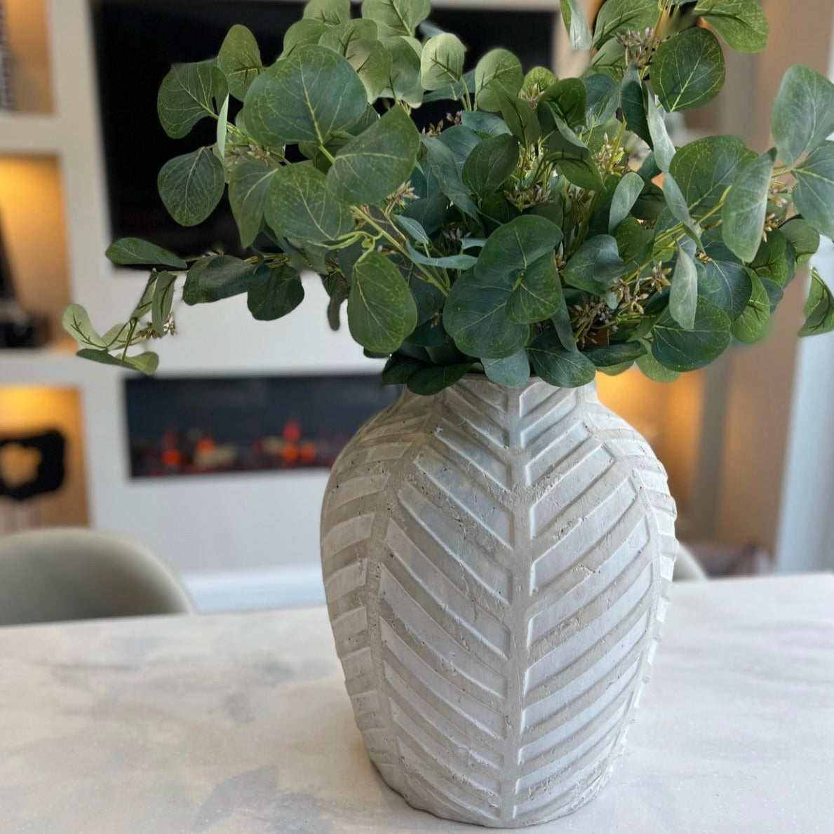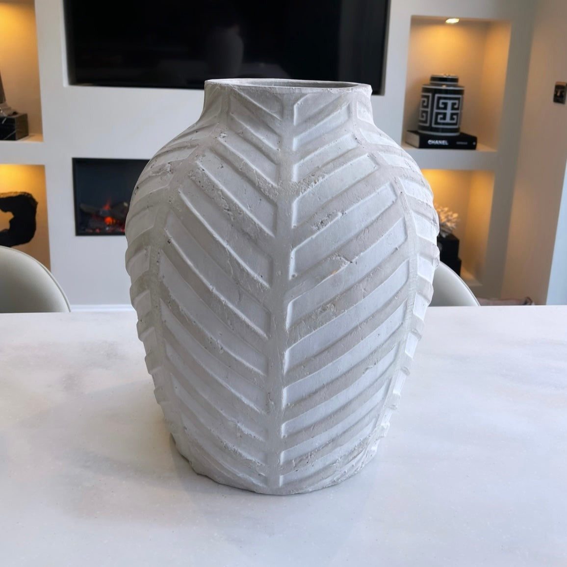 This is the beautiful Lourdez Stone Vase. A wonderfully earthy and neutral piece with an eye-catching geometric pattern that will hold broad appeal.
