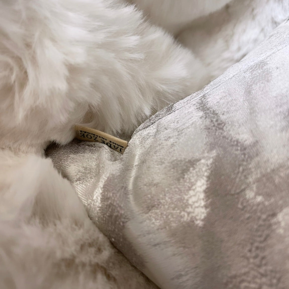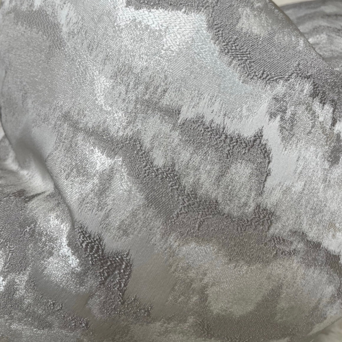 The true allure of this cushion lies in its sumptuous sheen textured fabric. With shades of Silver, Greys and white, it effortlessly captures the essence of sophistication. Each thread has been meticulously woven to create a mesmerising interplay of light, giving the cushion a luminous quality that enchants the eye.