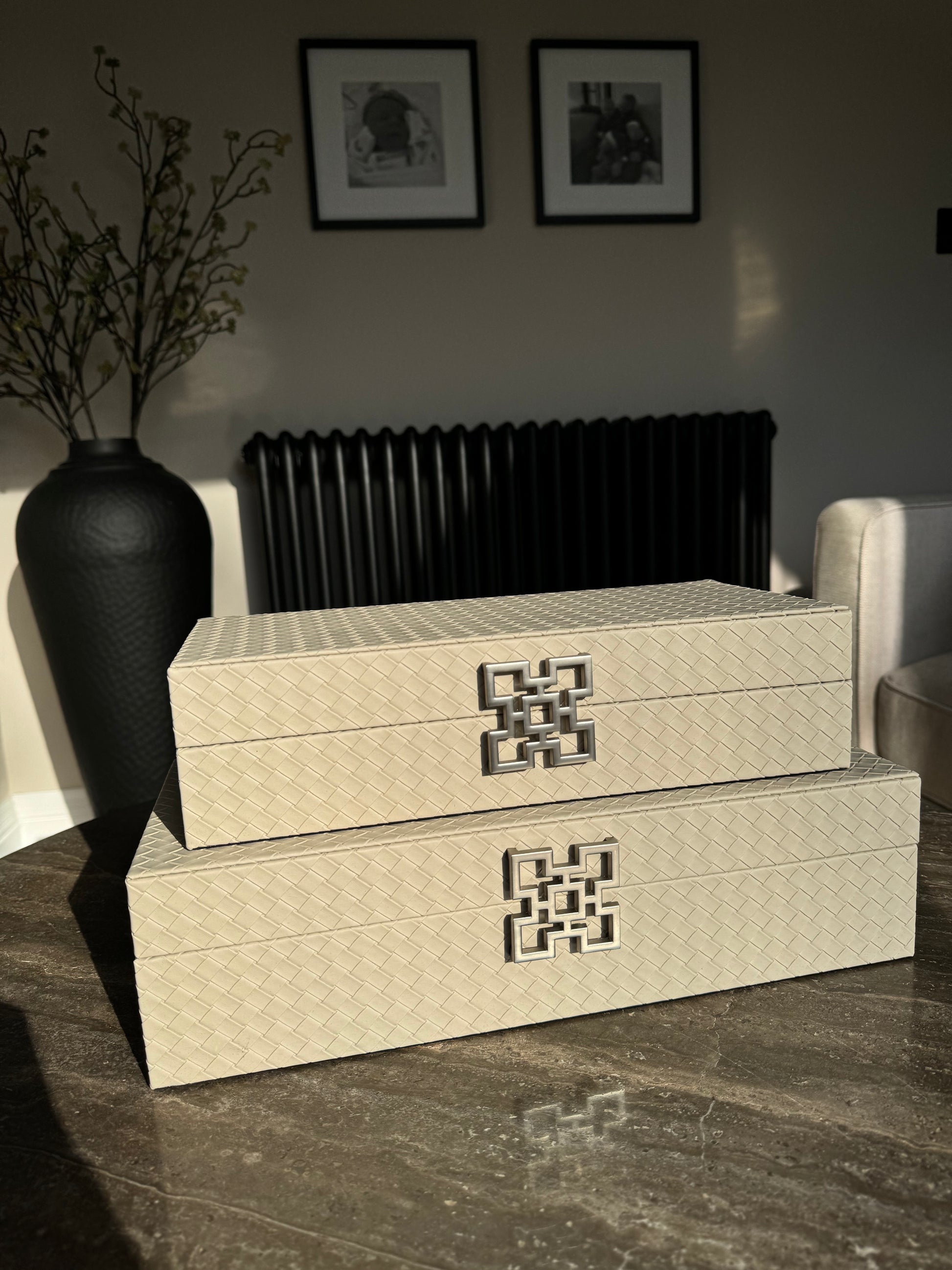 Keep your jewellery organized in style with this set of 2 grey faux leather jewellery boxes. Finished in smooth faux leather and accented with sleek matte silver handles, these boxes bring a modern, elegant touch to any space. The soft velvet-lined interior protects rings, earrings, necklaces, and more from scratches and damage. With two practical sizes, they’re perfect for everyday use or as a stylish gift.