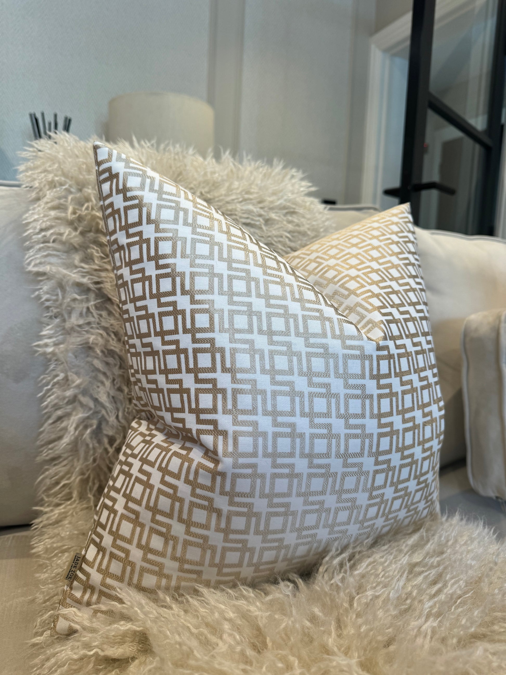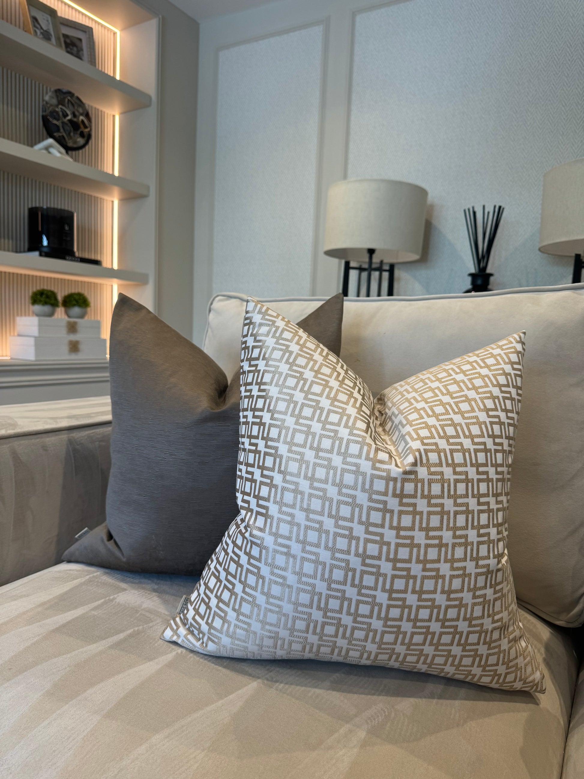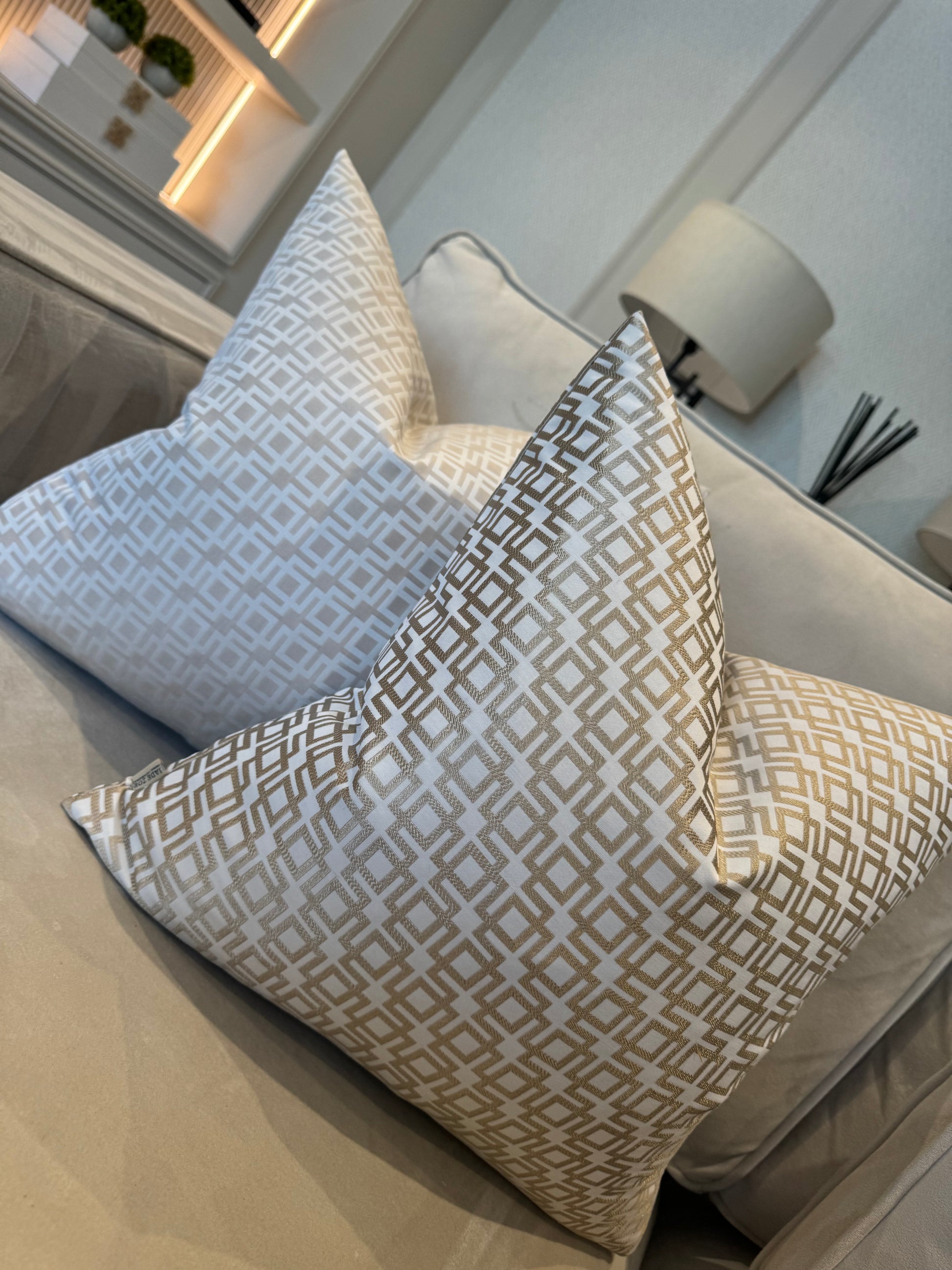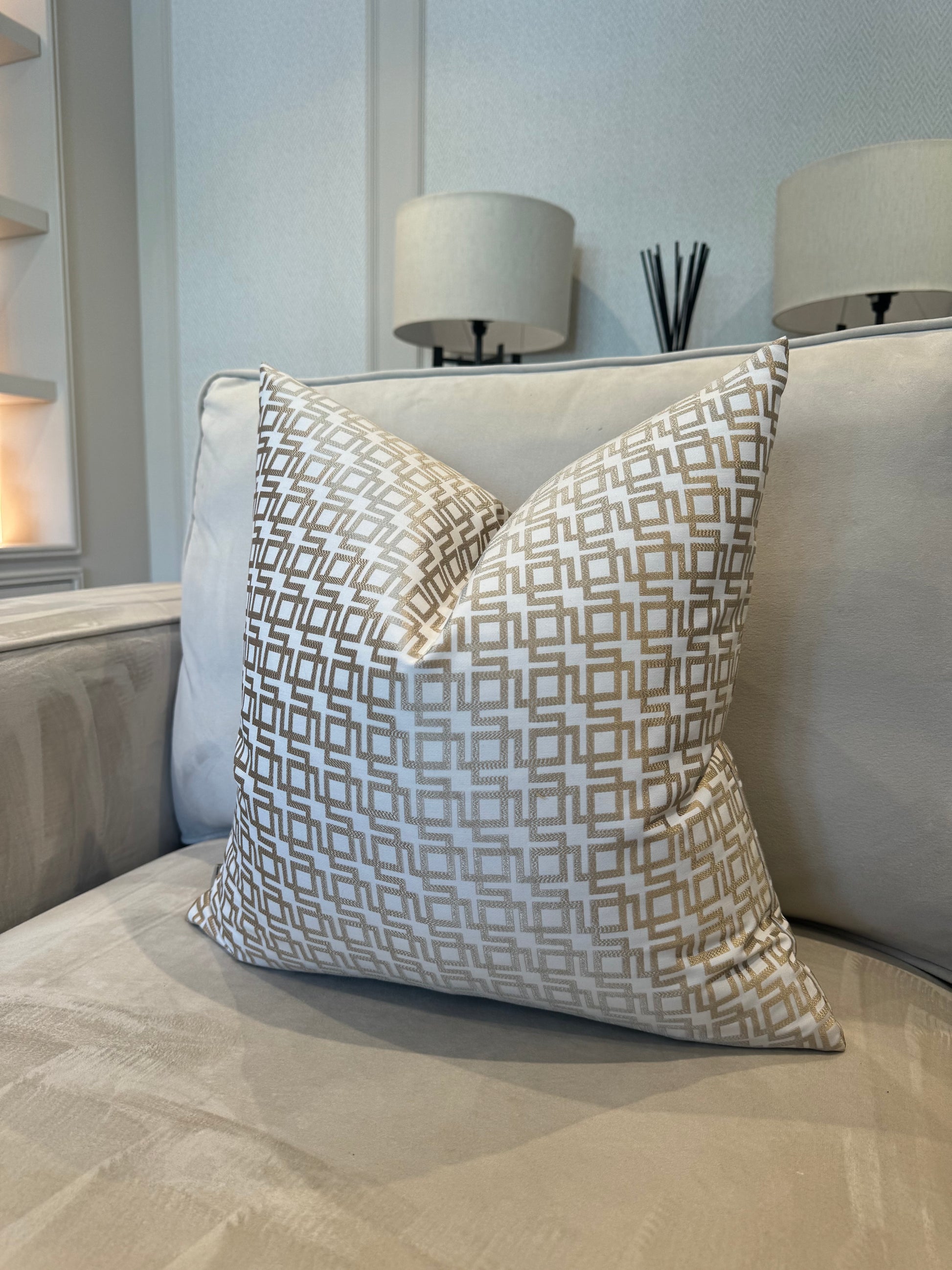 Elevate your interiors with the understated elegance of our Vienna Geometric Cushion. Featuring a beautifully woven taupe geometric pattern set against a soft off-white backing, this design brings a refined balance of contemporary pattern and timeless neutral tones. The intricate interlocking motif adds subtle depth and visual interest, making it a versatile statement piece for both modern and classic interiors.