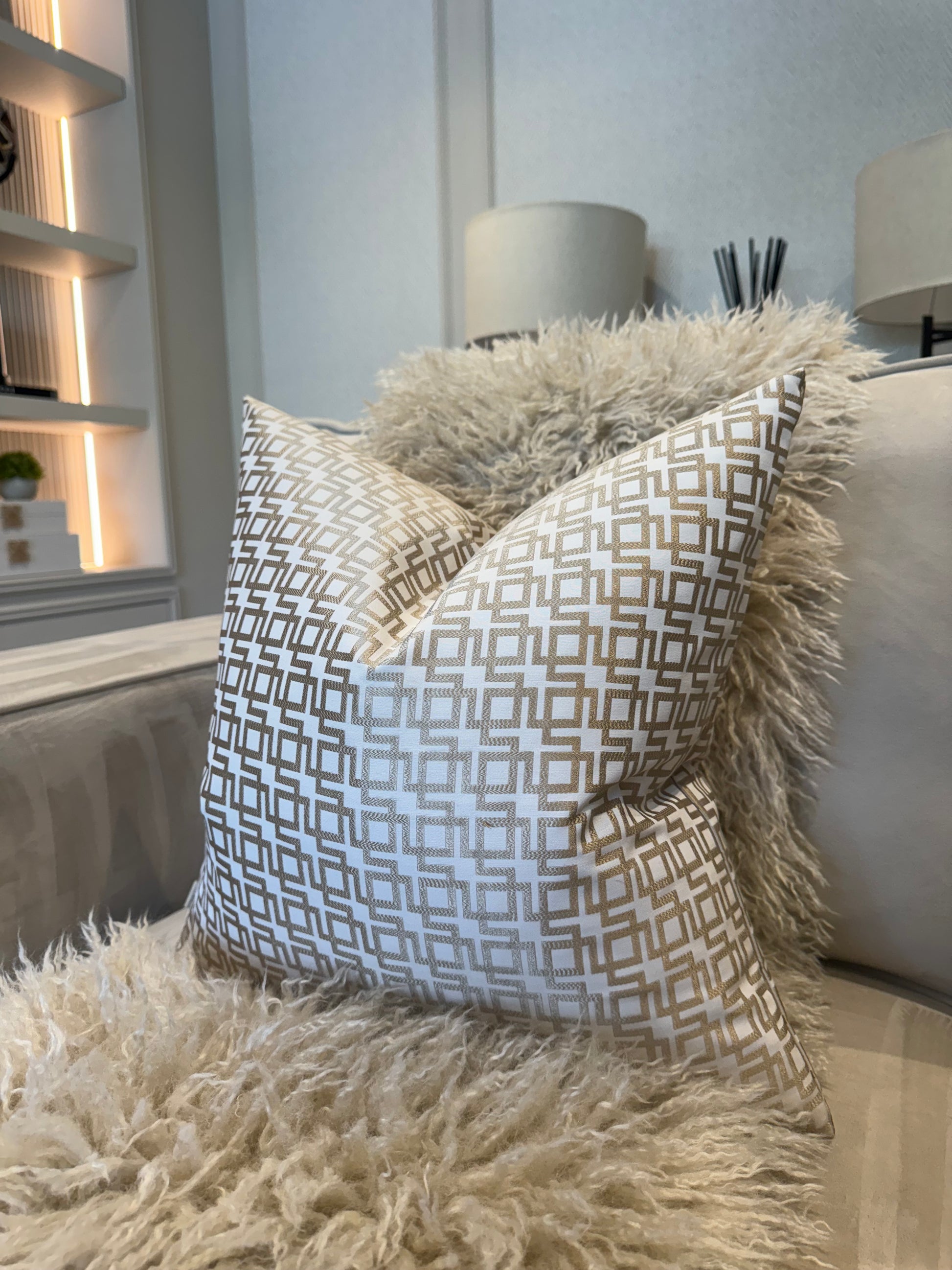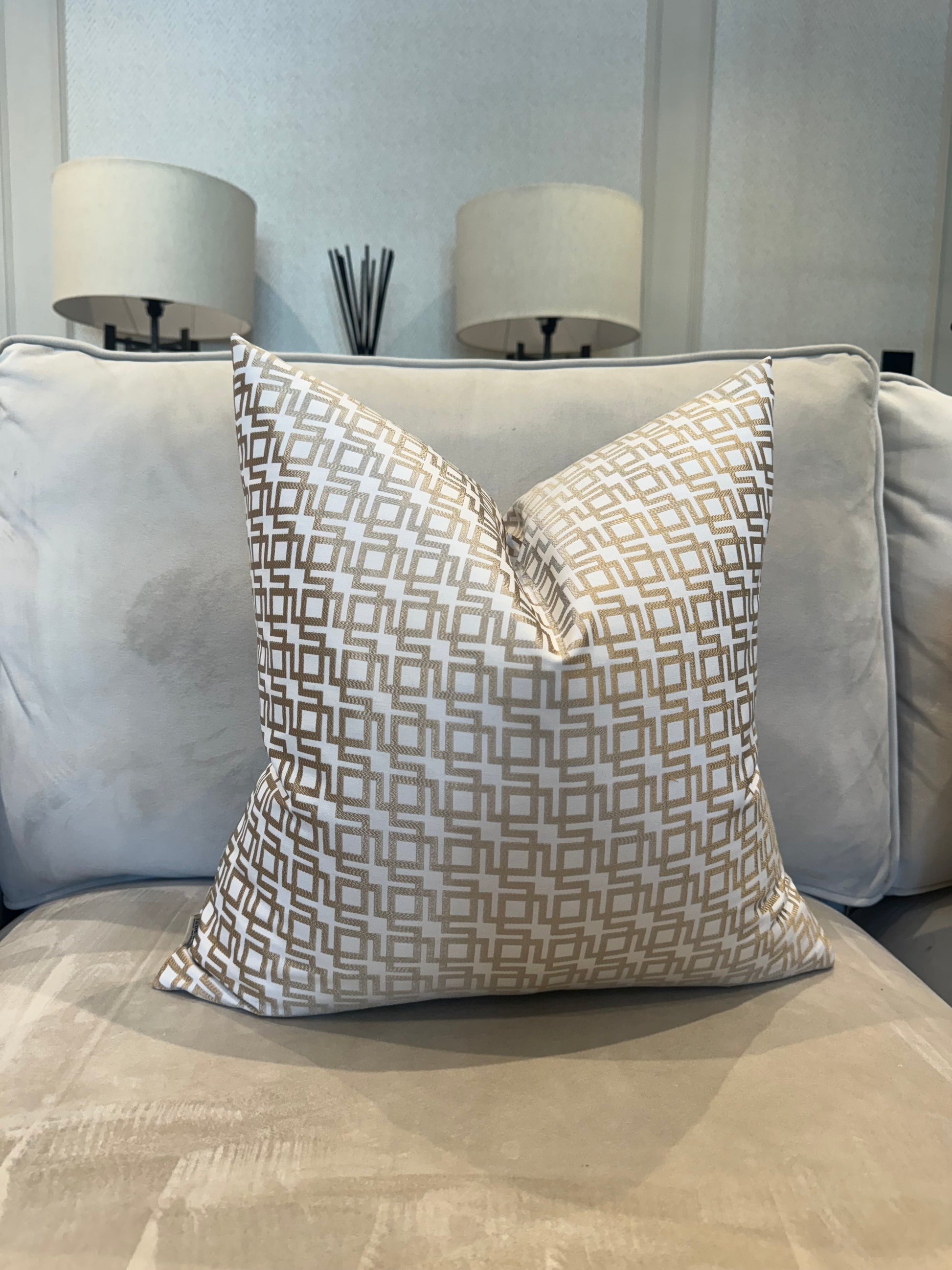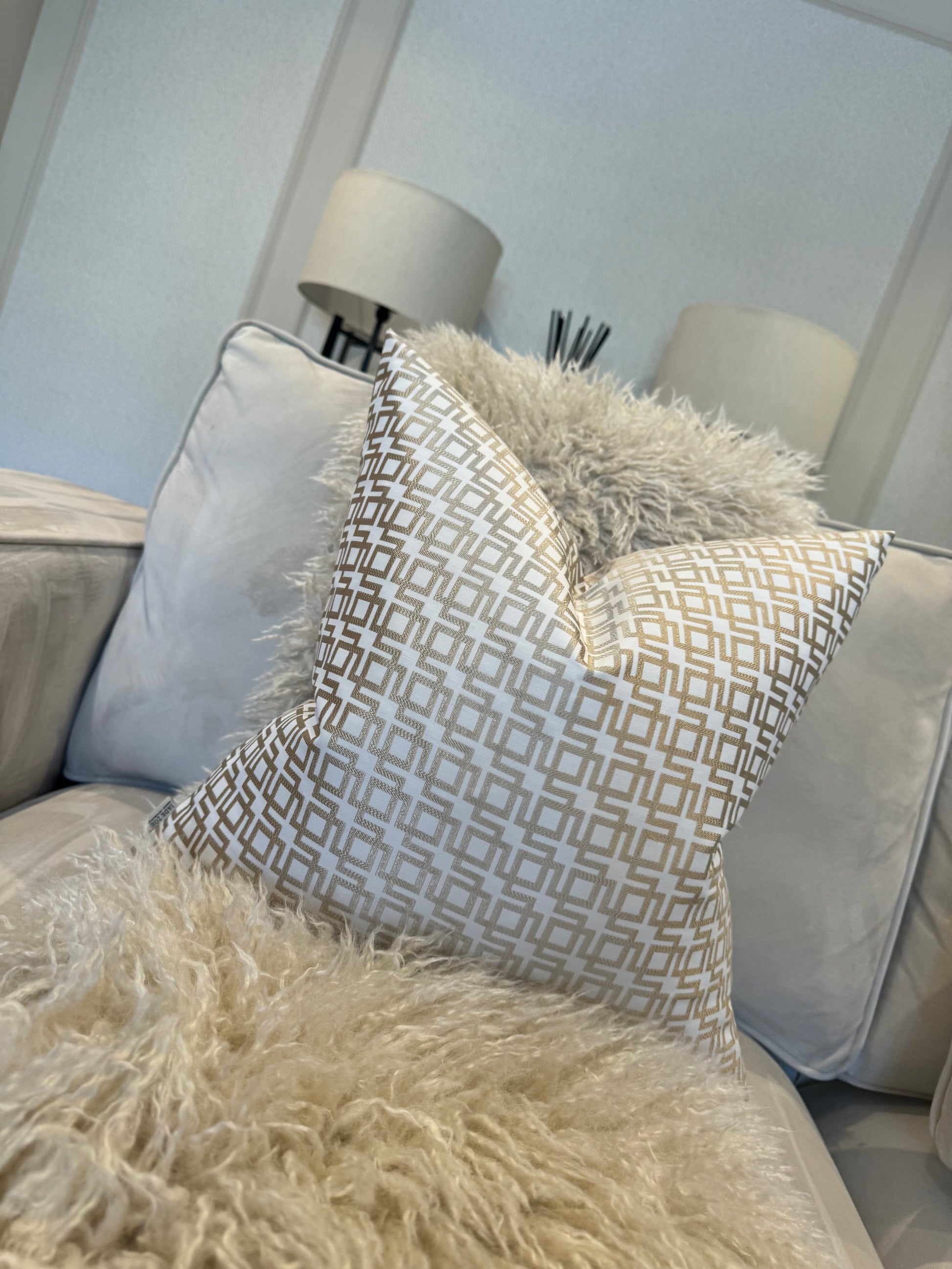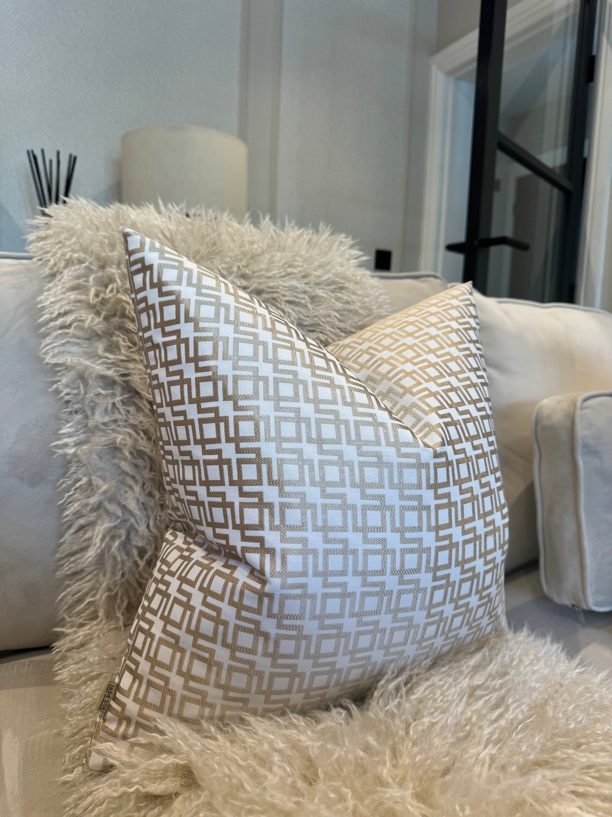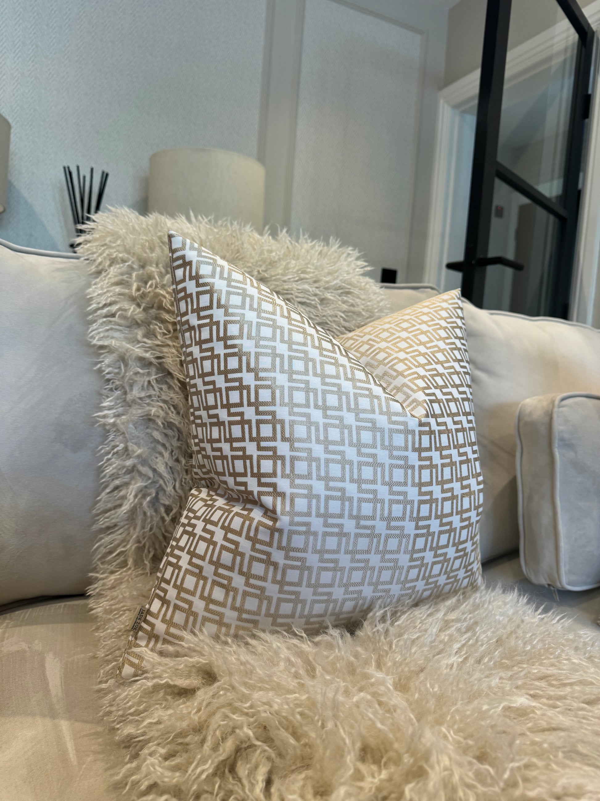 Elevate your interiors with the understated elegance of our Vienna Geometric Cushion. Featuring a beautifully woven taupe geometric pattern set against a soft off-white backing, this design brings a refined balance of contemporary pattern and timeless neutral tones. The intricate interlocking motif adds subtle depth and visual interest, making it a versatile statement piece for both modern and classic interiors.
