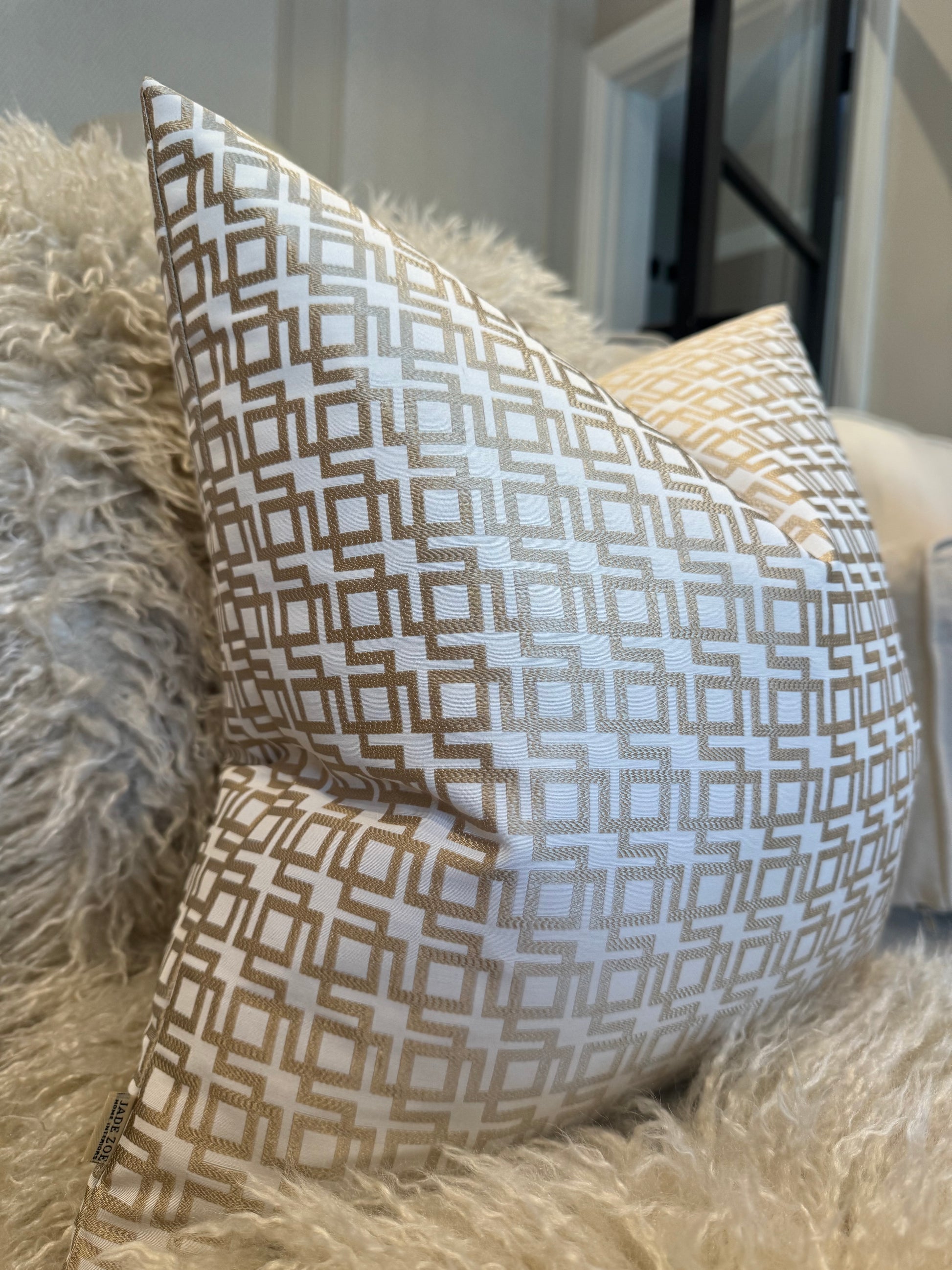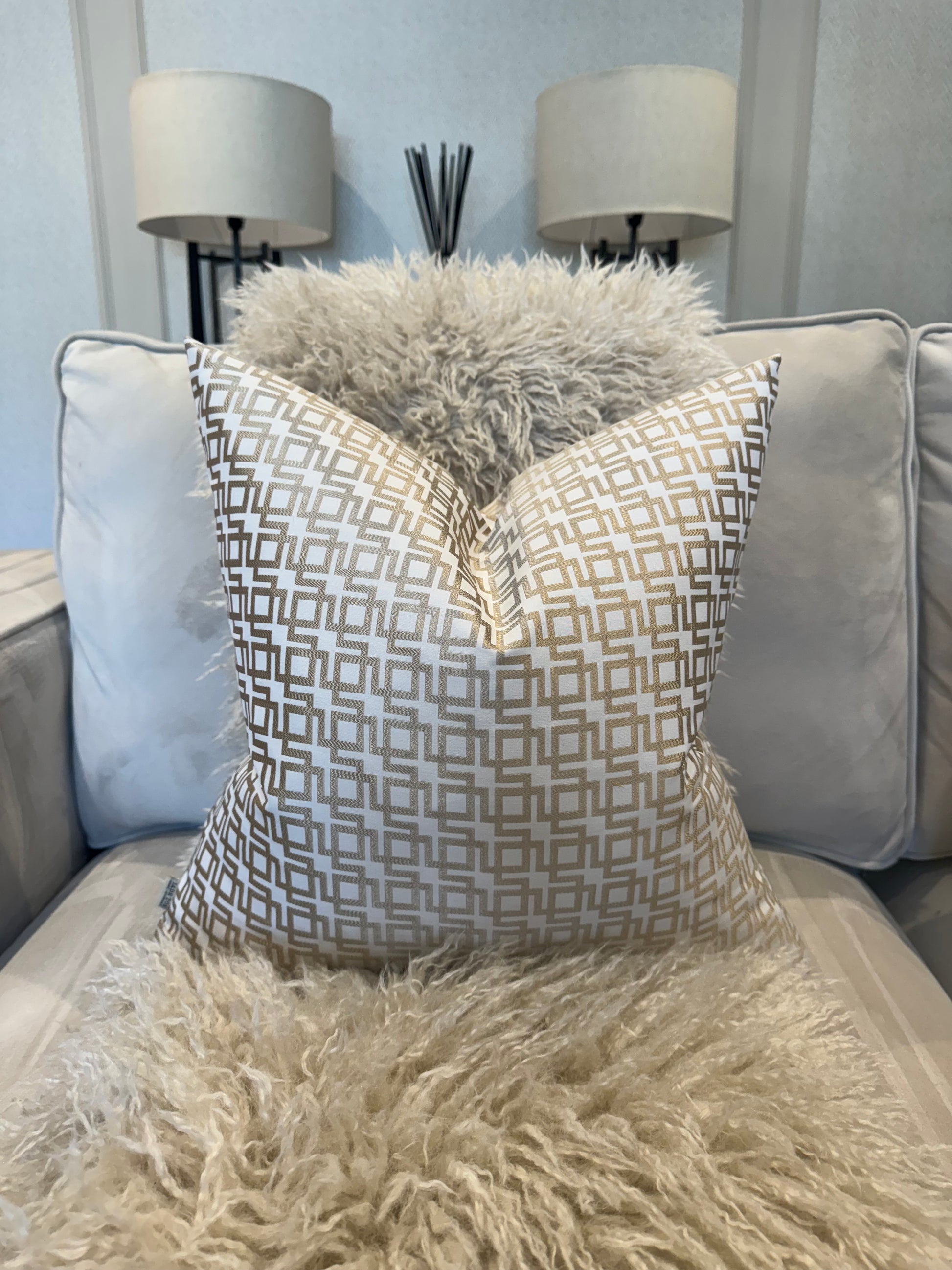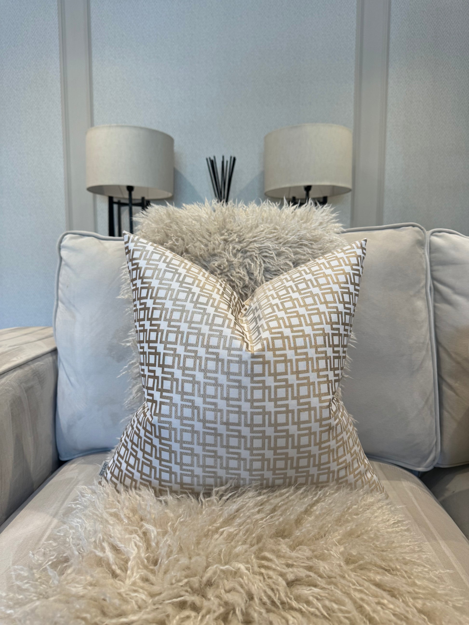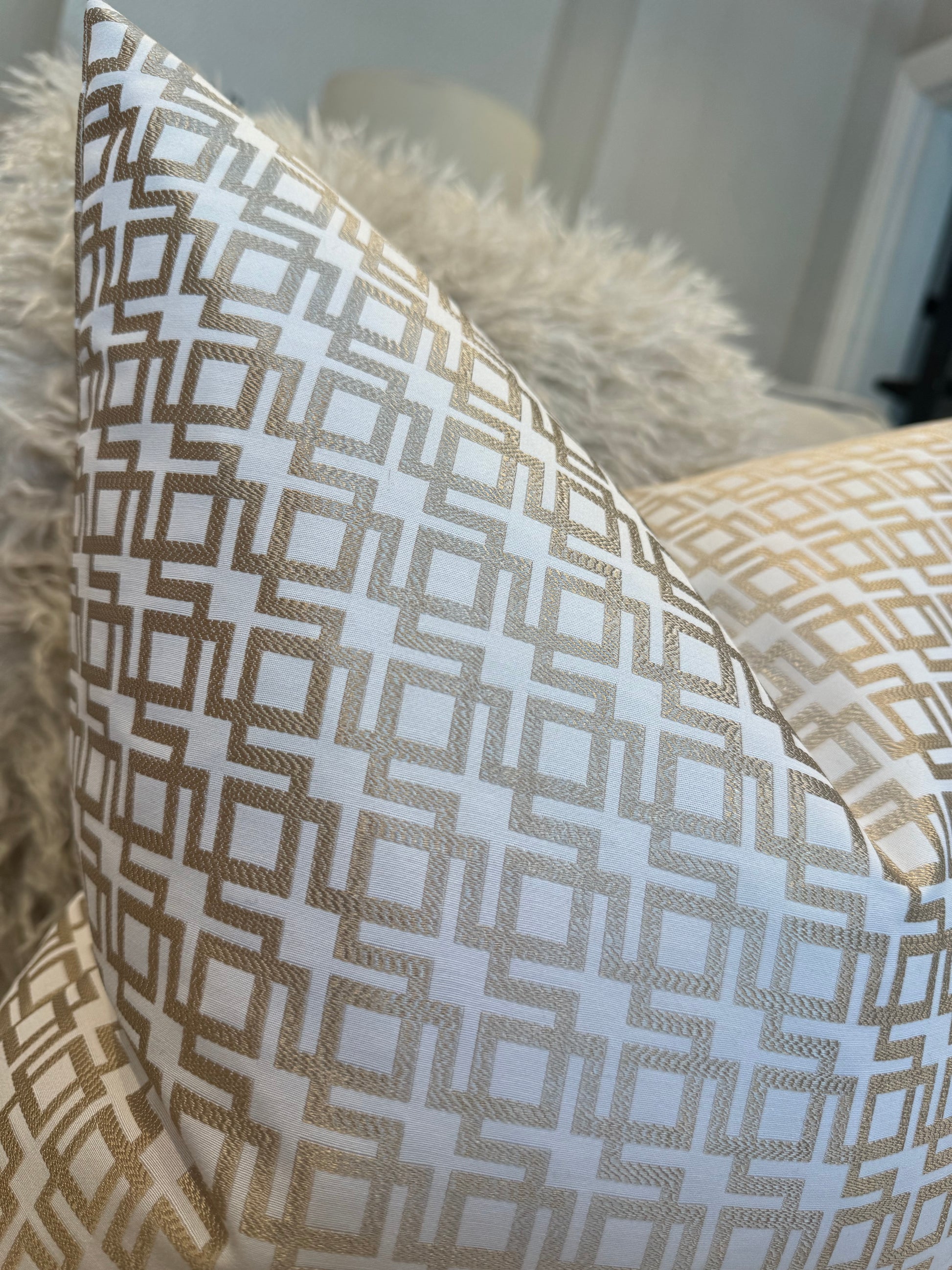 Elevate your interiors with the understated elegance of our Vienna Geometric Cushion. Featuring a beautifully woven taupe geometric pattern set against a soft off-white backing, this design brings a refined balance of contemporary pattern and timeless neutral tones. The intricate interlocking motif adds subtle depth and visual interest, making it a versatile statement piece for both modern and classic interiors.
