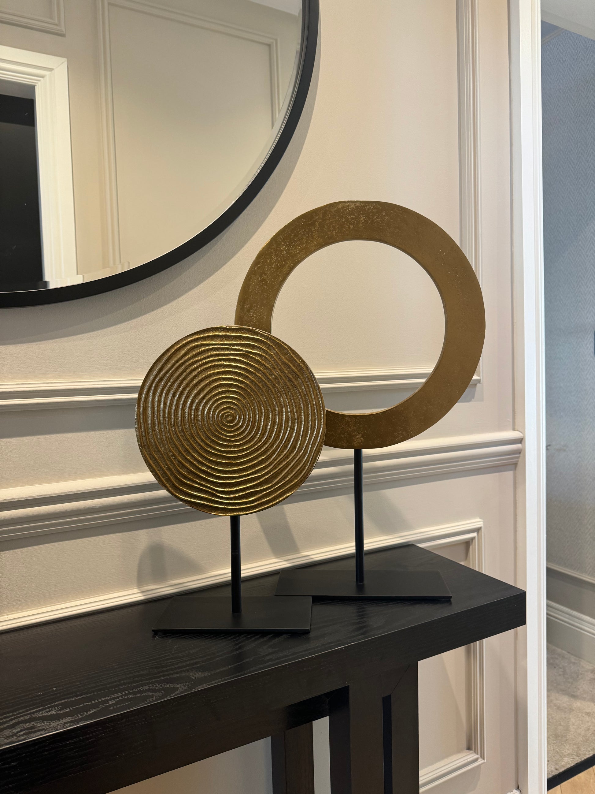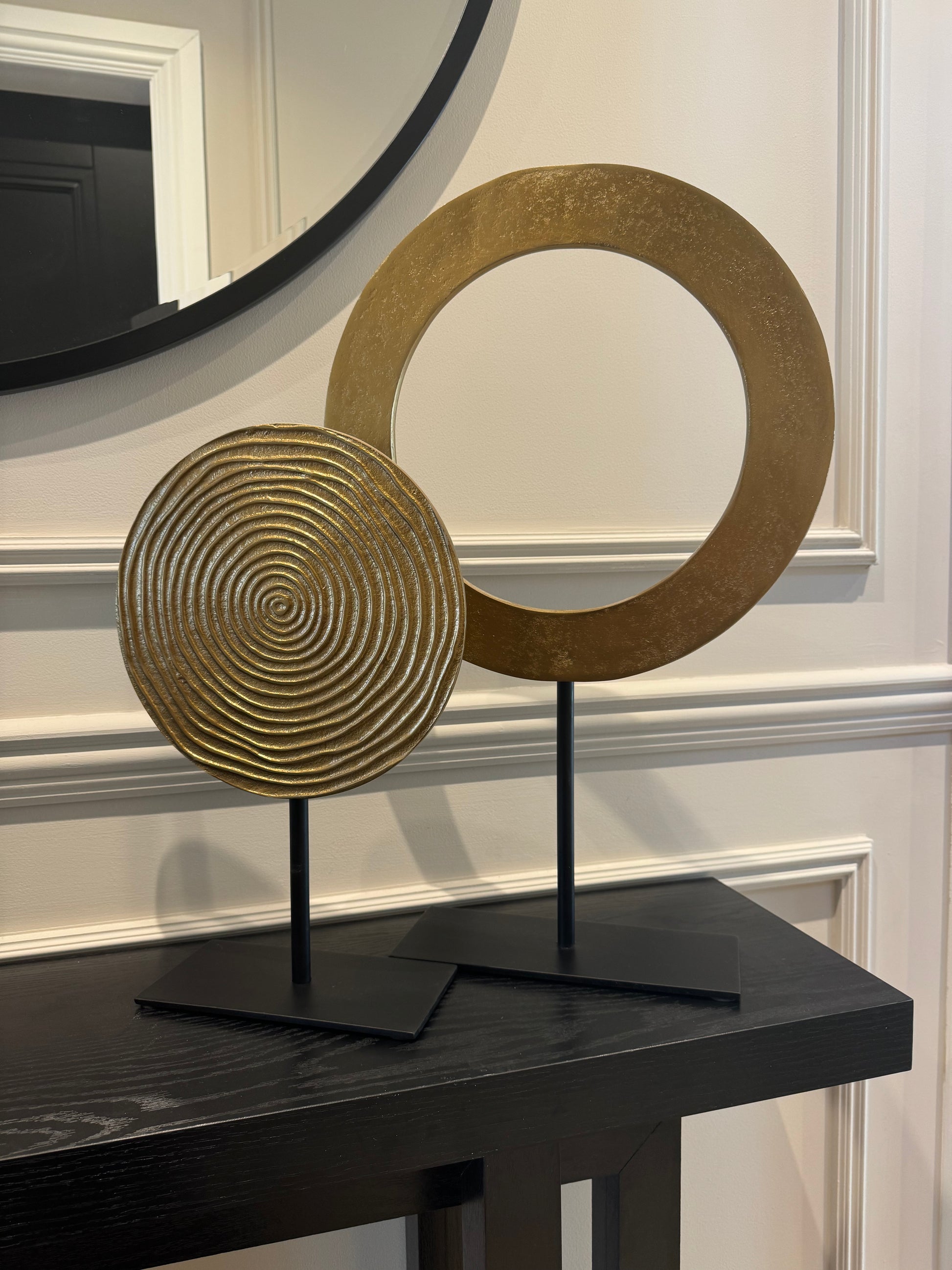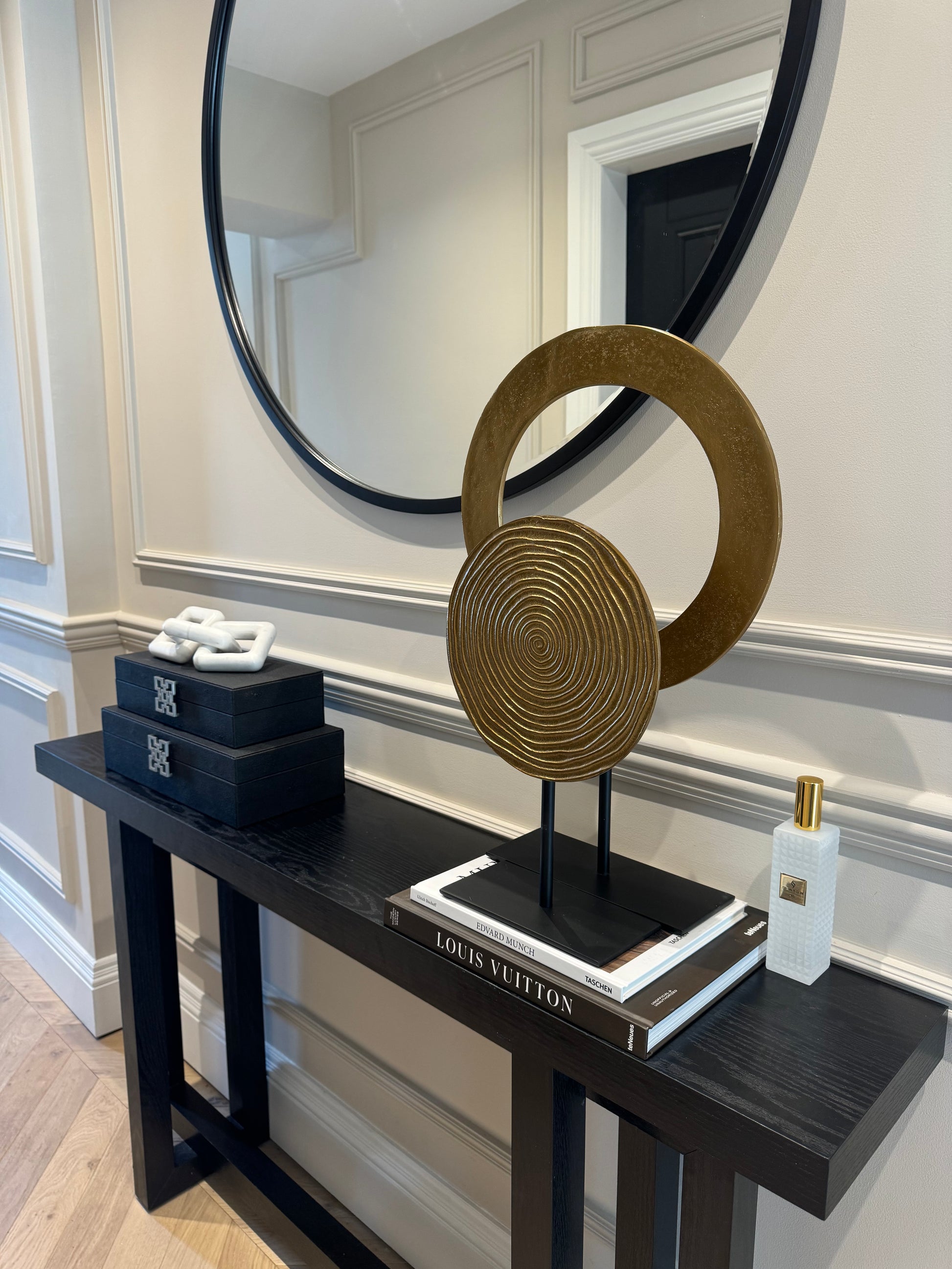 Introduce bold sophistication to your interior with the WAIWO decorative ornament, featuring an eye-catching design in a rich antique bronze finish and a cut out centre. This tall and elegant sculpture stands proudly on a sleek matt black base, creating a striking contrast that enhances its modern, sculptural appeal.