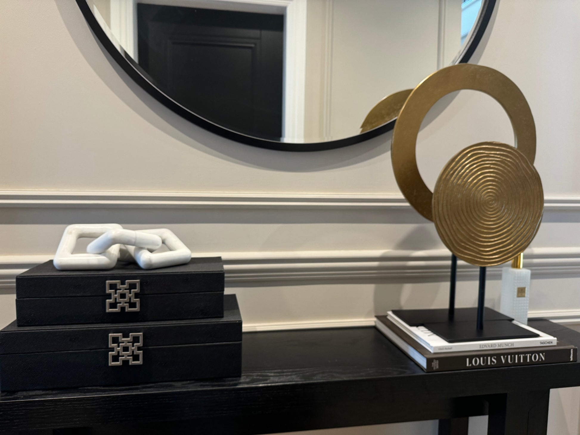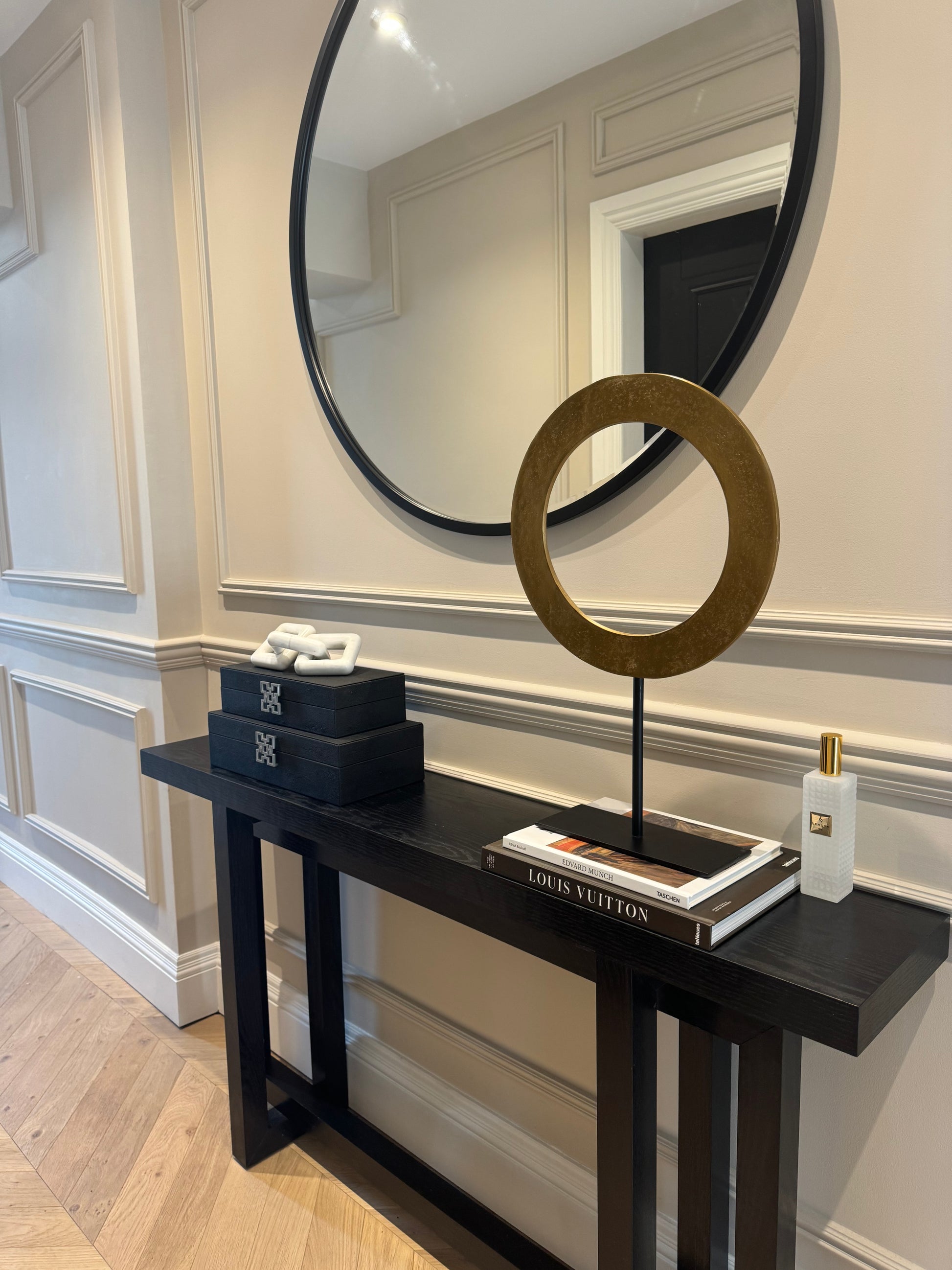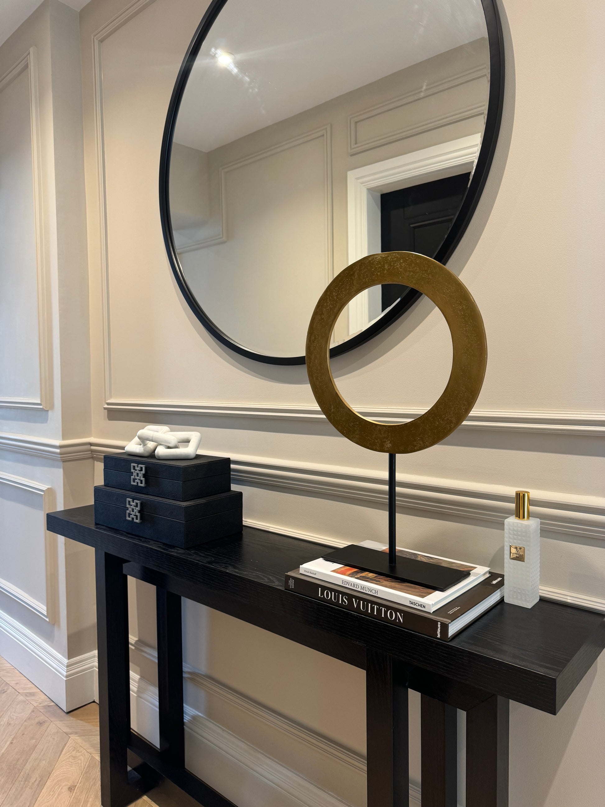Introduce bold sophistication to your interior with the WAIWO decorative ornament, featuring an eye-catching design in a rich antique bronze finish and a cut out centre. This tall and elegant sculpture stands proudly on a sleek matt black base, creating a striking contrast that enhances its modern, sculptural appeal.