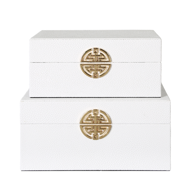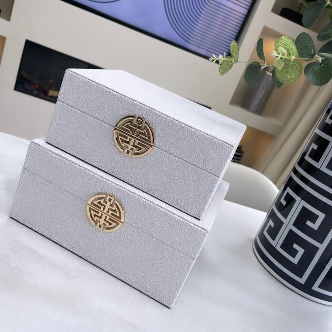 White Faux Leather Gold Buckle Storage Boxes Set Of 2