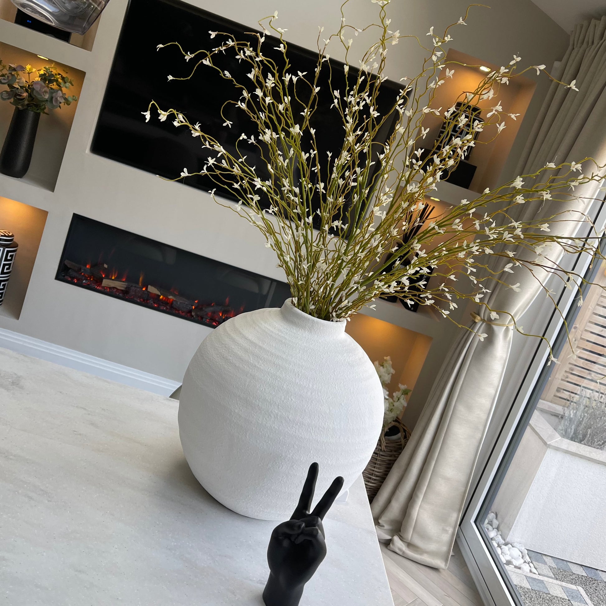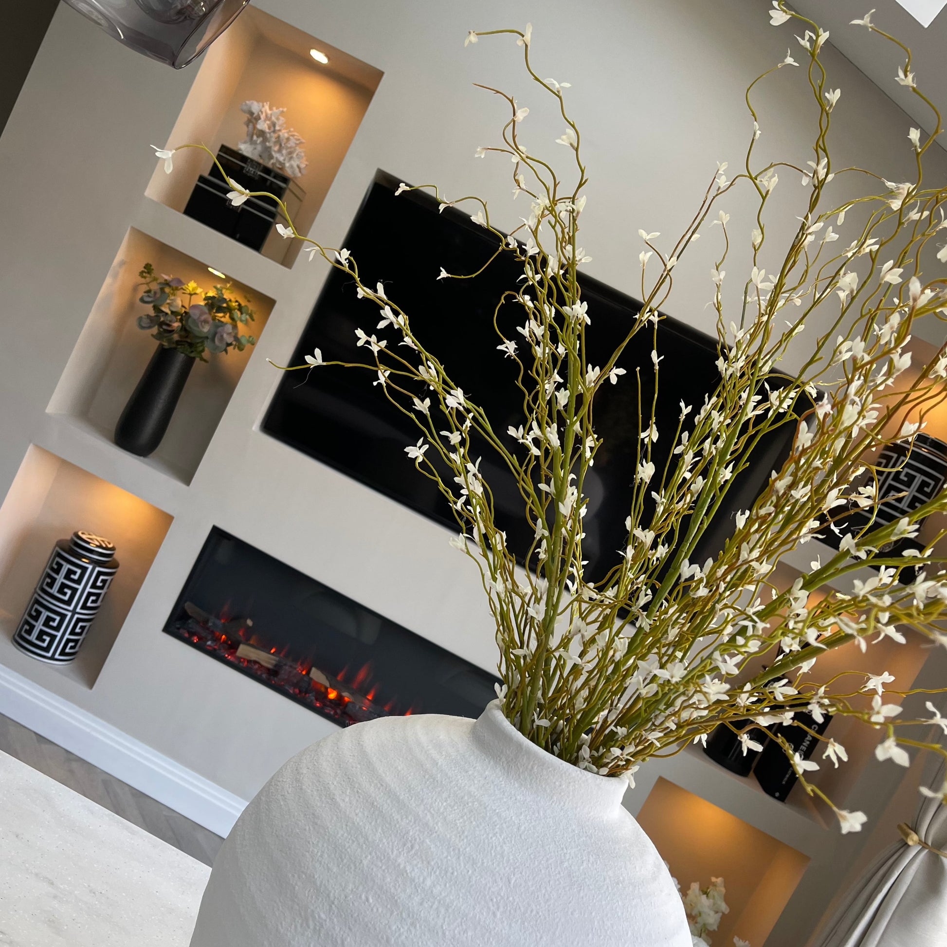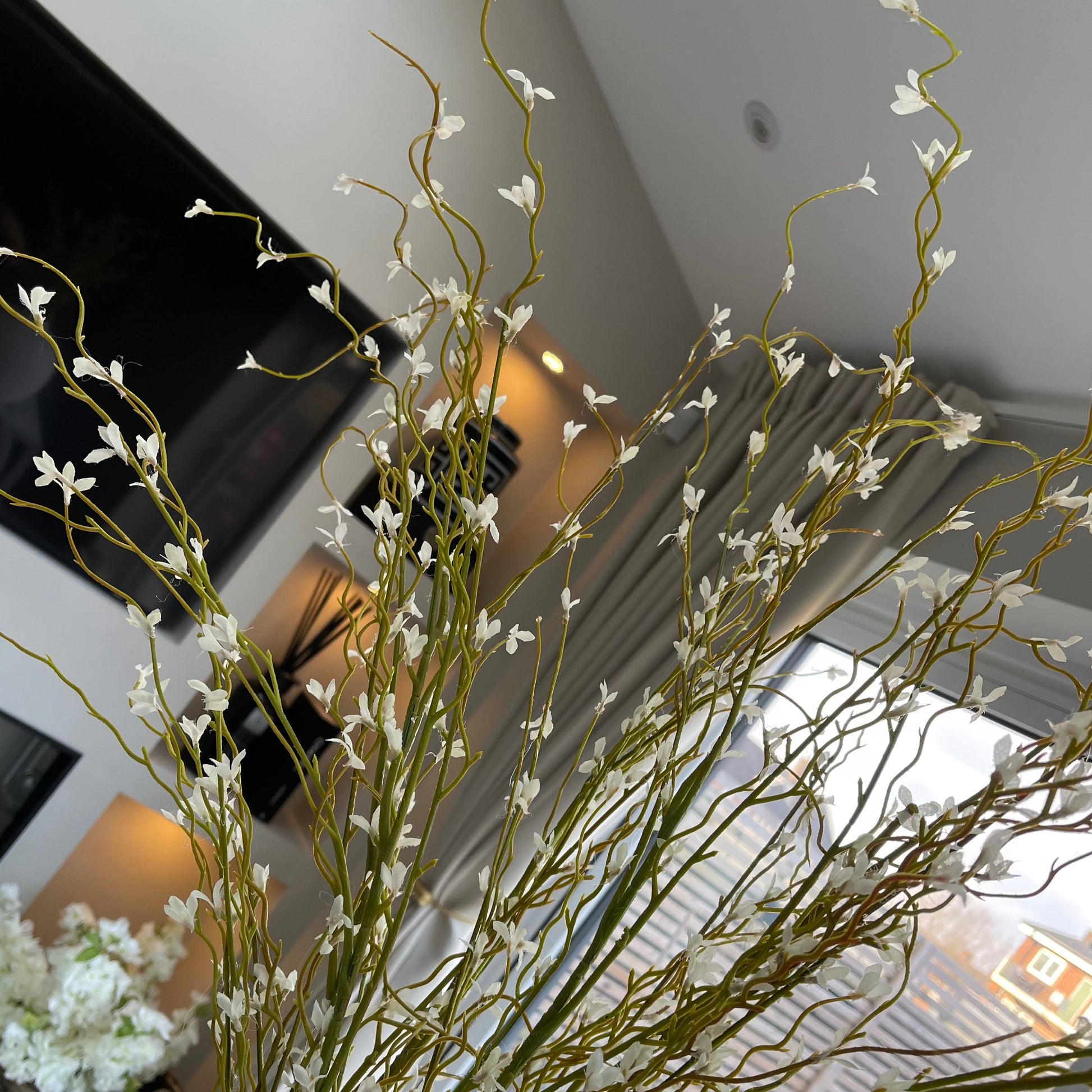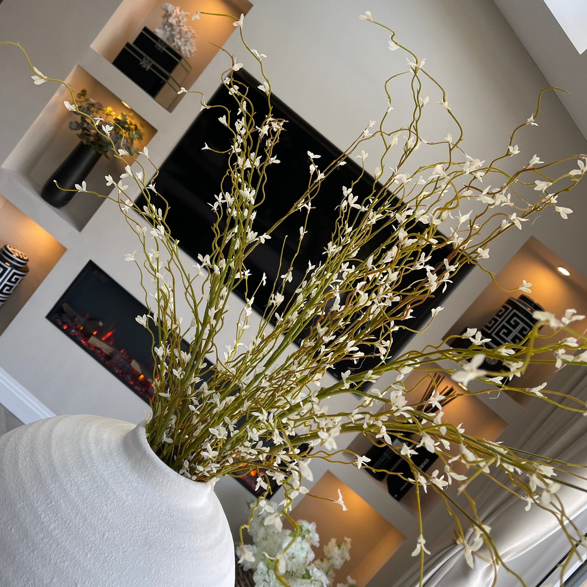 A tall single stem spray of faux white flowering pussy willow. This tall stem is of elegant proportions and will add height and movement to any arrangement.